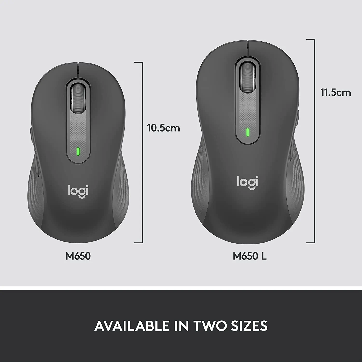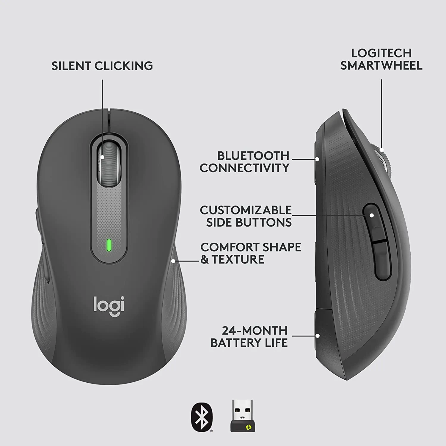 The Logitech Signature M650 Wireless Mouse in Graphite is designed for comfort and productivity. Ideal for small to medium-sized hands, this mouse features both Logi Bolt and Bluetooth connectivity options, allowing seamless use across various devices.