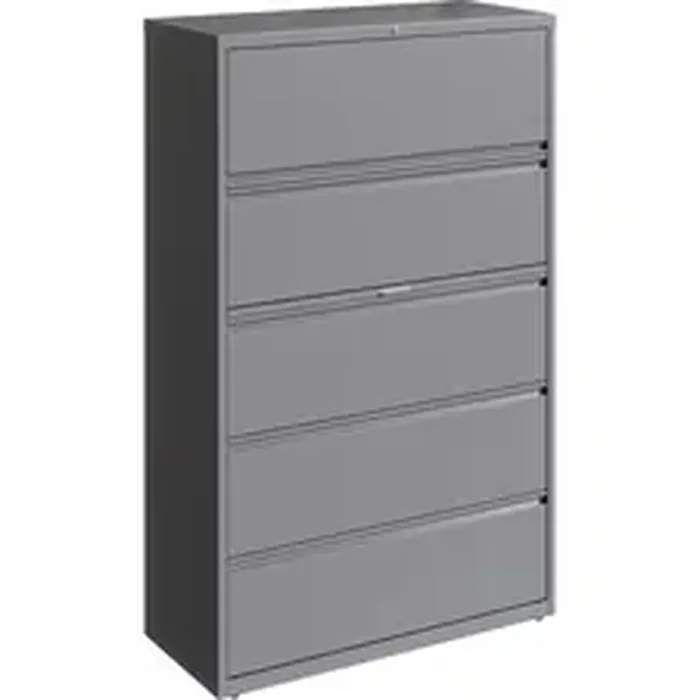 42" wide lateral file features a roll-out binder storage/posting shelf and four drawers with hanging file rails for side-to-side filing in letter-size, legal-size or A4-size for versatility. Each drawer has a magnetic label holder for easy identification where you need it. Design also features a core-removable lock for security, dual locking bars, full-width pull, ball-bearing slide suspension for smooth opening and closing, reinforced base, and four adjustable leveling guides for stabilization. Interlock system prohibits the extension of more than one drawer at a time for your safety. Counterweight prevents tipping. Lateral file meets or exceeds applicable ANSI/BIFMA standards.