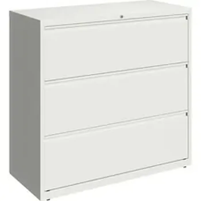 42" wide lateral file features three versatile drawers with hanging file rails for side-to-side filing in letter-size, legal-size or A4-size. Each drawer has a magnetic label holder for easy identification where you need it. Design also features a core-removable lock for security, dual locking bars, full-width pull, ball-bearing slide suspension for smooth opening and closing, reinforced base, and four adjustable leveling guides for stabilization. Interlock system prohibits the extension of more than one drawer at a time for your safety. Counterweight prevents tipping. Lateral file meets or exceeds applicable ANSI/BIFMA standards.