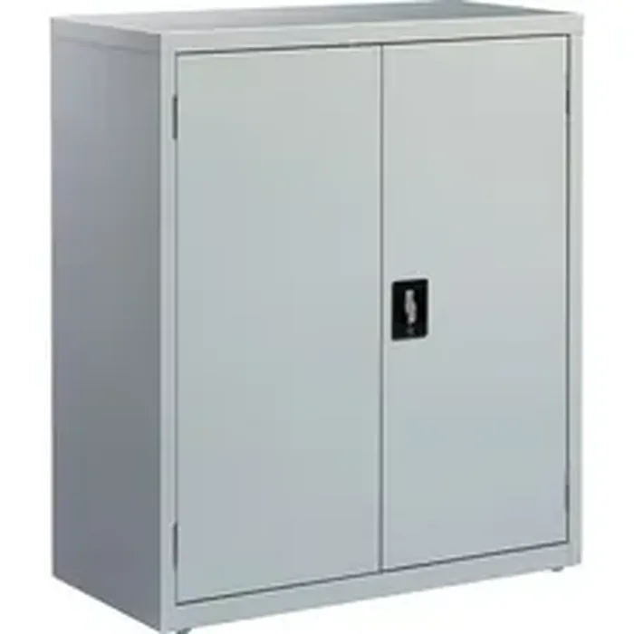 Storage cabinet offers a sturdy, private storage space for your office. Secure your belongings using the contemporary, three-point, recessed locking handle with keys. Durable cabinet is made of welded steel and holds 180 lb. per shelf, evenly distributed. Two shelves are fully adjustable in 2" increments. The bottom shelf is fixed. Welded steel construction has a powder-coat finish to make it last longer. 42" high cabinet also features two sets of hinges per door and meets or exceeds ANSI/BIFMA standards.