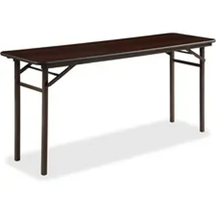 Folding banquet table offers a convenient 18" width for easy access to a spread of food or interactive presentations. Mahogany melamine top is 5/8" thick. Coil steel frame features a powder-coat finish for durability.