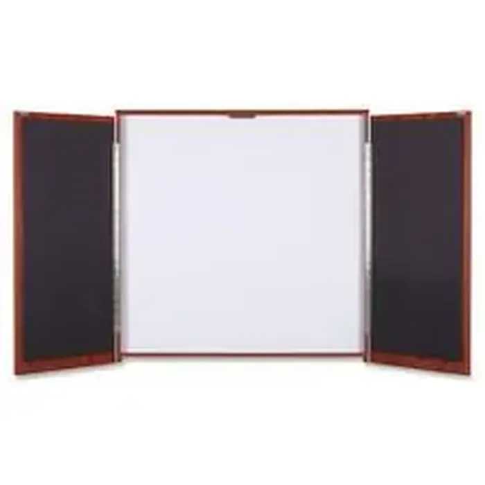 Presentation cabinet offers an elegant solution for your meeting needs. Hinged doors close to hide the dry-erase surface inside and possibly your important brainstorming. The 18mm Cherry laminate doors with 2mm matched edgebanding are lined in black fabric tackboards for more meeting tools. The internal melamine whiteboard supplies the dry-erase surface. Cabinet includes cleat mounting hardware.