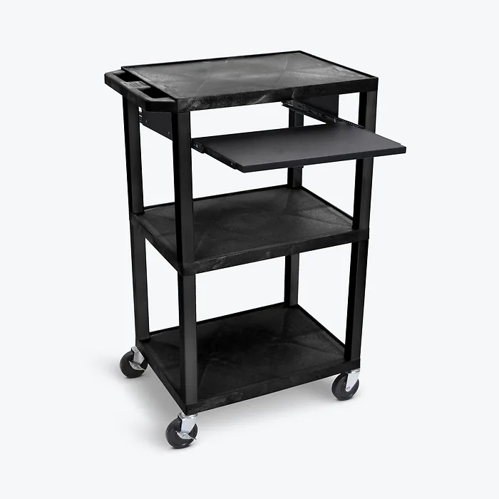 In addition to three 1.5"-thick molded plastic shelves that won't scratch, dent, rust or stain, this durable AV cart has a front pullout tray that's ideal for supporting a keyboard or laptop, as well as a three-outlet recessed electrical assembly for convenient power access. The three primary shelves have a textured surface and .25" retaining lip to help secure items and a molded push handle for easy maneuverability. Four 4" full-swivel casters make it easy to roll the cart from location to location and two locking brakes allow you to quickly stabilize the cart when needed. Its strength, utility and mobility make this cart perfect for use with audio/video equipment.