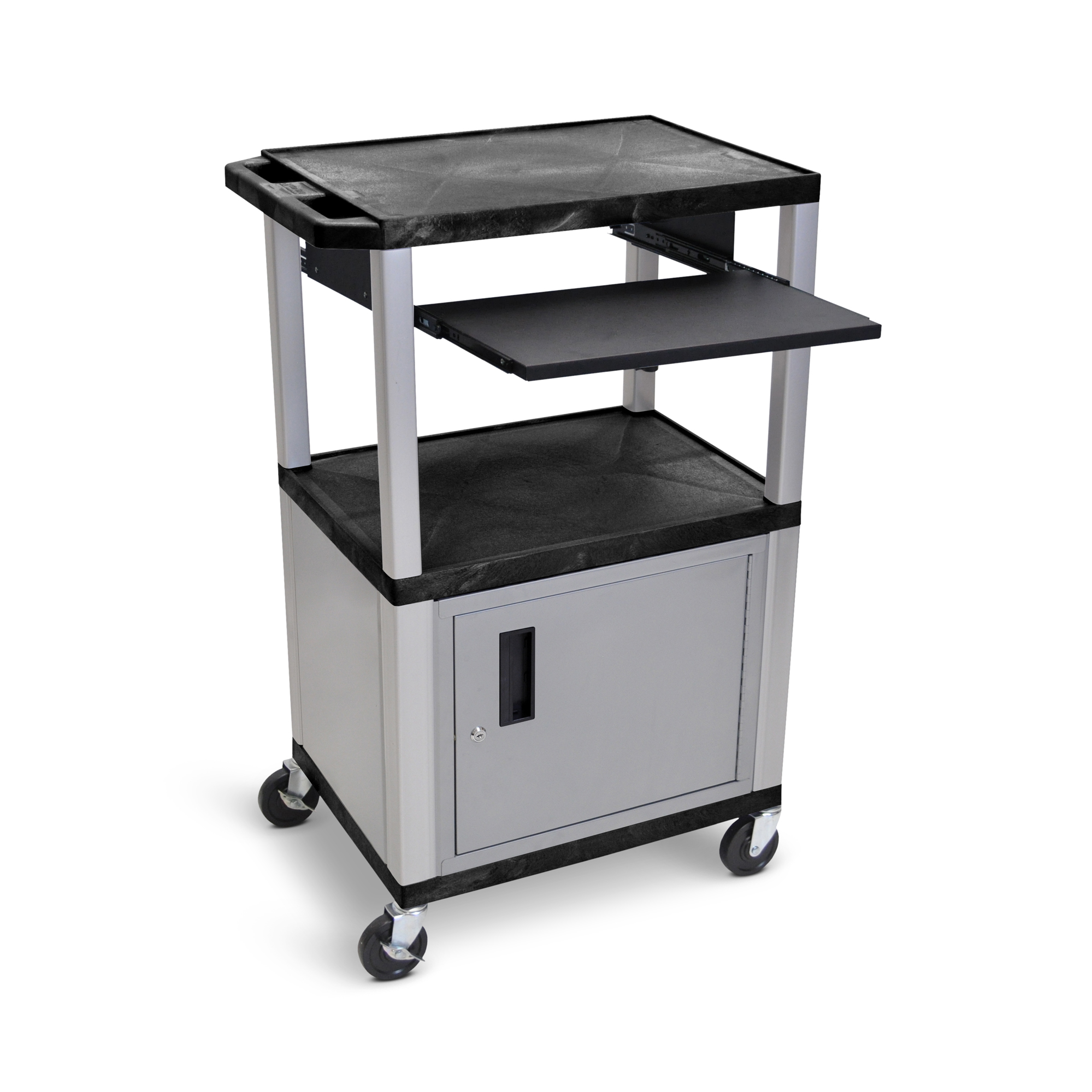 In addition to three 1.5"-thick molded plastic shelves that won't scratch, dent, rust or stain, this durable AV cart has a front pullout tray that's ideal for supporting a keyboard or laptop, as well as a locking steel cabinet to store equipment and recessed three-outlet electrical assembly for convenient power access. The three primary shelves have a textured surface and .25" retaining lip to help secure items and a molded push handle for easy maneuverability. Four 4" full-swivel casters make it easy to roll the cart from location to location and two locking brakes allow you to quickly stabilize the cart when needed. Its strength, utility and mobility make this cart perfect for use with audio/video equipment.