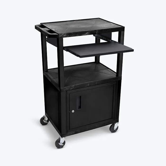 The Luxor Tuffy Black 42" 3-Shelf AV Cart is a versatile solution for any environment. With three robust 1.5"-thick molded plastic shelves that resist scratches, dents, rust, and stains, this cart is built for durability. It includes a convenient front pullout tray, perfect for holding a keyboard or laptop, and a locking steel cabinet for secure equipment storage. The recessed three-outlet electrical assembly provides easy access to power for your devices.
