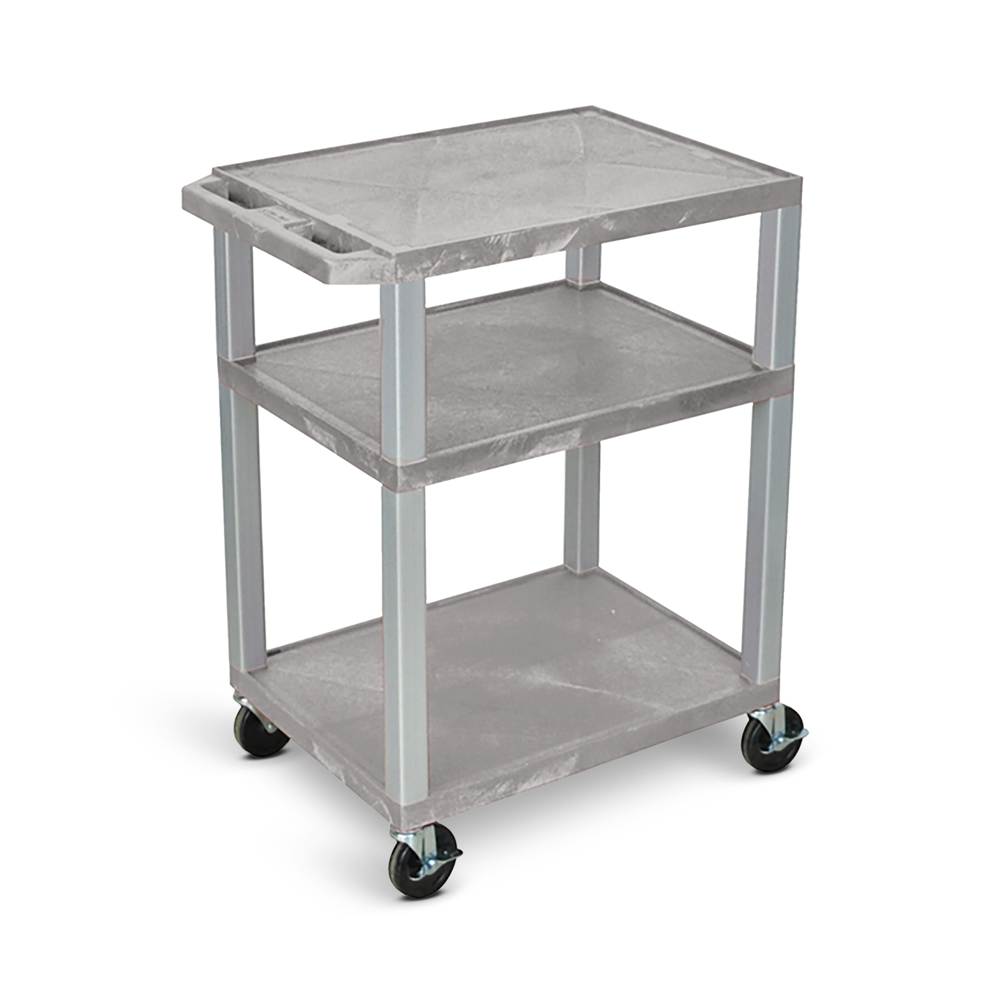 Made in the USA, this versatile AV cart has durable shelves made of molded plastic that won't chip, warp, scratch, rust or peel. Each shelf has a .25" retaining lip to help secure items and the top shelf has a recessed three-outlet UL-Listed electrical assembly. Square legs provide structural strength while four 4" full-swivel casters (two with locking brake), along with a push handle molded into the top shelf, make this cart easy to maneuver.