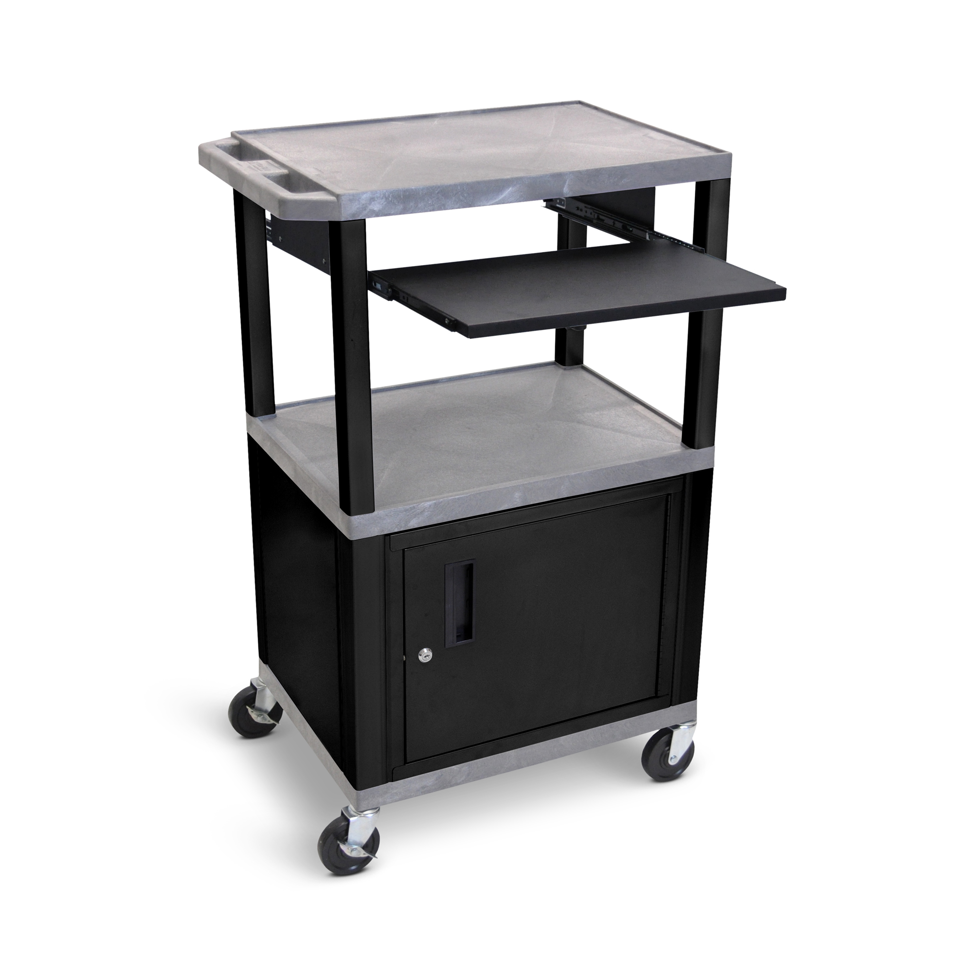 In addition to three 1.5"-thick molded plastic shelves that won't scratch, dent, rust or stain, this durable AV cart has a front pullout tray that's ideal for supporting a keyboard or laptop, as well as a locking steel cabinet to store equipment and recessed three-outlet electrical assembly for convenient power access. The three primary shelves have a textured surface and .25" retaining lip to help secure items and a molded push handle for easy maneuverability. Four 4" full-swivel casters make it easy to roll the cart from location to location and two locking brakes allow you to quickly stabilize the cart when needed. Its strength, utility and mobility make this cart perfect for use with audio/video equipment.