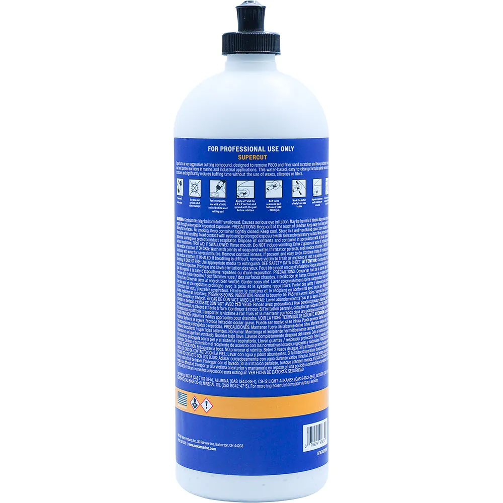 Malco Marine Super Cut Compound is an ultra-aggressive compound designed to remove P800 and finer dual-action or wet-sand scratches and medium to light oxidation from gel coat, fiberglass, and select painted surfaces.