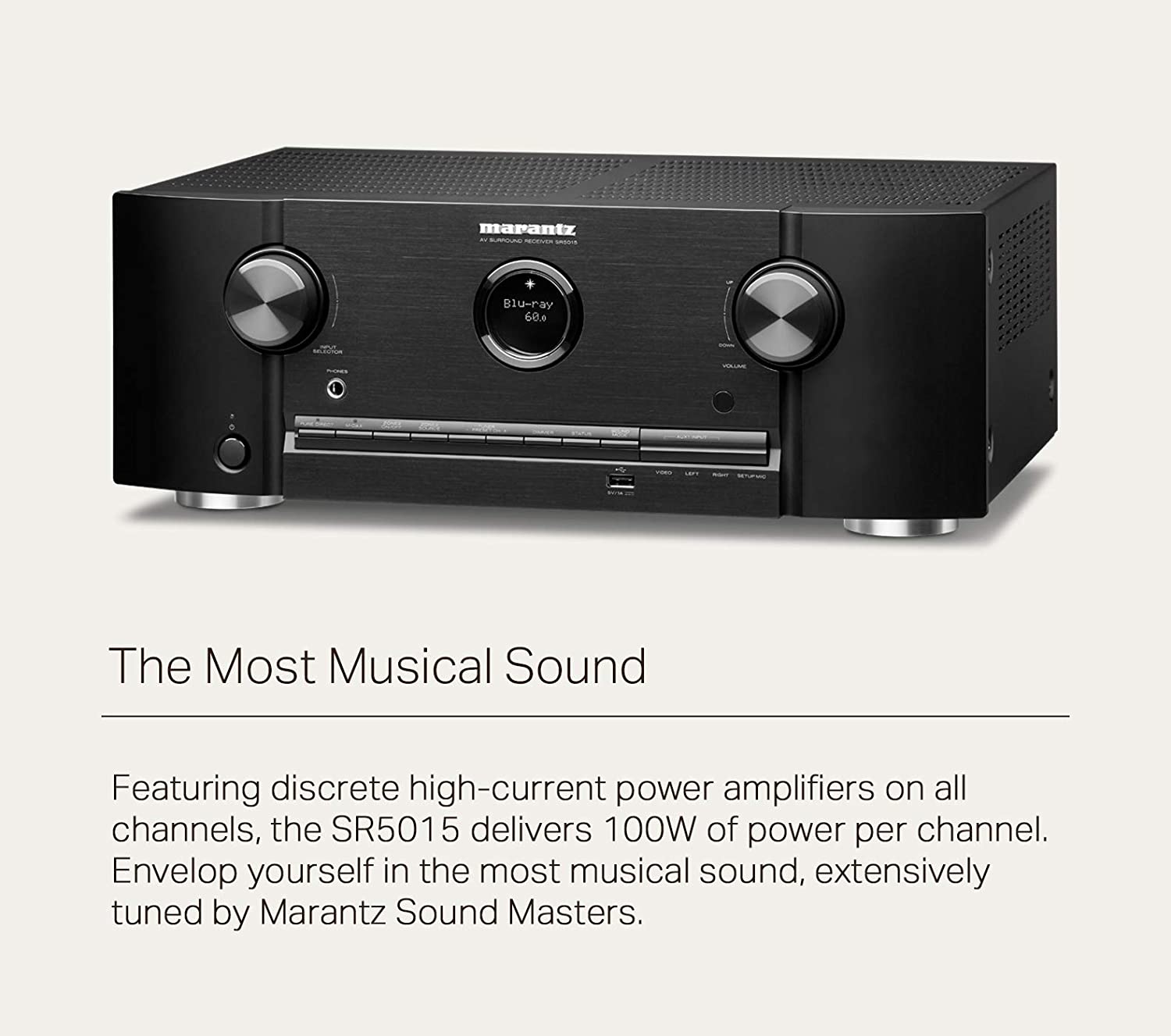- UPGRADED 7.2 CHANNEL DISCRETE HIGH-CURRENT POWER AMPLIFIERS ON ALL CHANNELS – Refine your home theater experience with the new Marantz SR5015 stereo receiver (100 W x 7) with ADVANCED 8K HDMI UPSCALLING for extraordinary visuals and superb sound quality