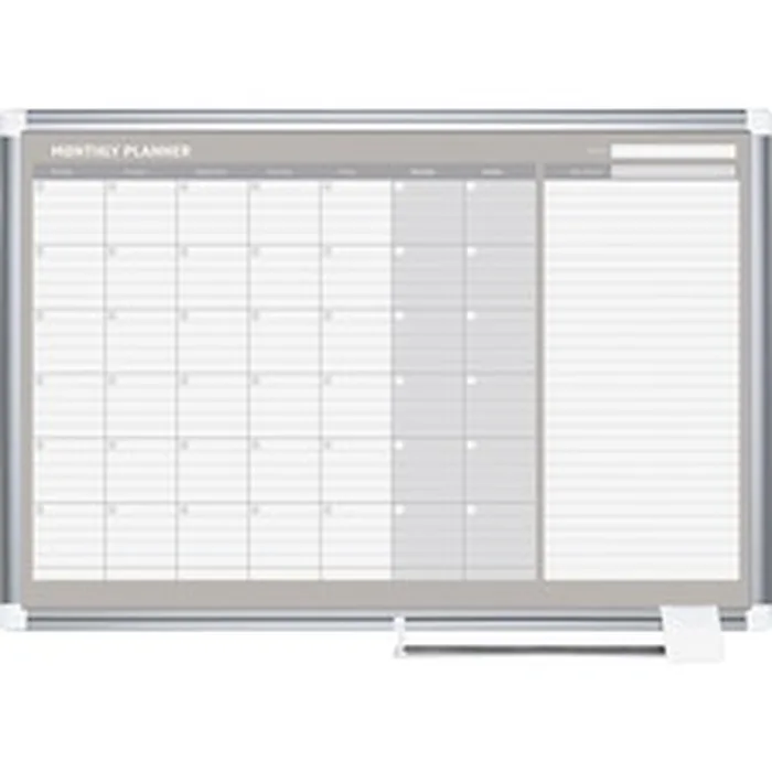 Monthly planner offers the perfect planning and presentation solution, suiting all office needs. Magnetic Gold Ultra dry-erase surface is scratch-resistant and ghost-resistant. Calendar is ideal for managing teams and schedules with ample room for any month. The write-on/wipe-off month features ruled daily blocks, Monday-through-Saturday scheduling, shaded weekends and a ruled notes column. Modern, sturdy aluminum frame allows the board to fit any environment, and a sliding pen tray keeps all accessories close at hand. Dry-erase planner includes a wall-fastening kit.