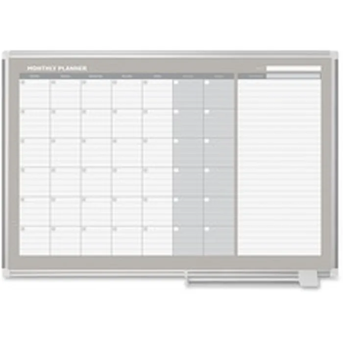 Monthly planner offers the perfect planning and presentation solution, suiting all office needs. Magnetic Gold Ultra dry-erase surface is scratch-resistant and ghost-resistant. Calendar is ideal for managing teams and schedules with ample room for any month. The write-on/wipe-off month features ruled daily blocks, Monday-through-Saturday scheduling, shaded weekends and a ruled notes column. Modern, sturdy aluminum frame allows the board to fit any environment, and a sliding pen tray keeps all accessories close at hand. Dry-erase planner includes a wall-fastening kit.