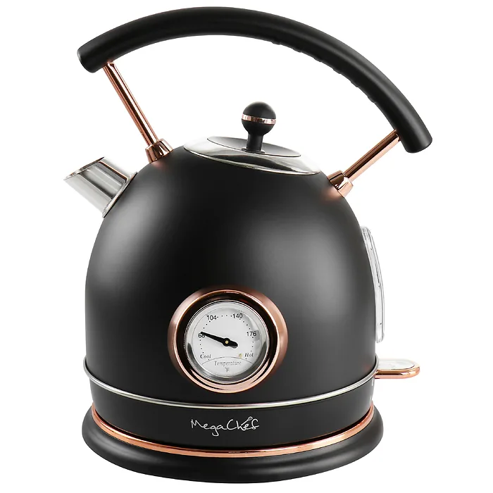 Experience retro elegance with the MegaChef 1.8 Liter Half Circle Electric Tea Kettle in Matte Black with Rose Gold accents. This stylish kettle combines vintage design with modern functionality, making it a stunning addition to any kitchen.