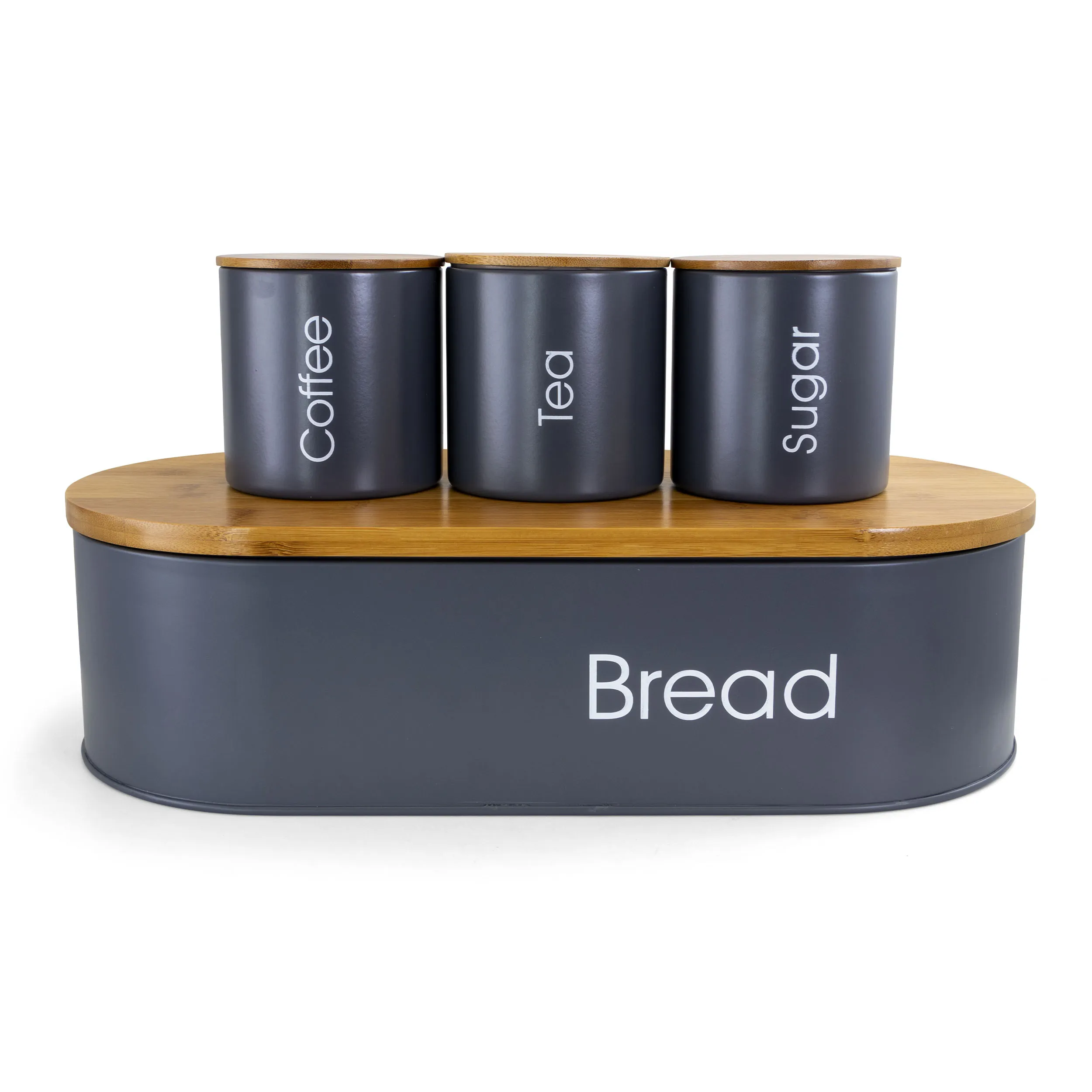 Megachef MG-317 Bamboo Kitchen Countertop 4 Piece Metal Bread Basket And Canister Set In Gray With Lids