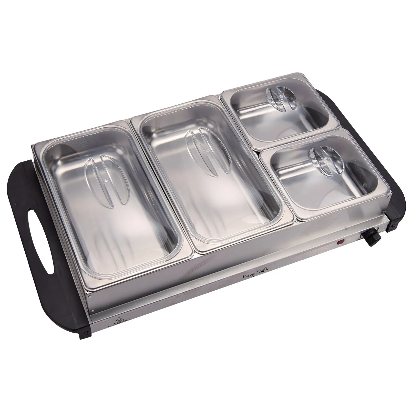 The MegaChef Buffet Server & Food Warmer With 4 Removable Sectional Trays , Heated Warming Tray and Removable Tray Frame is designed with you in mind. This ultimate party sidekick will make your guests feel as though they are being served a delicious hot meal at the most exclusive banquet. You will love the versatility of this wonderful buffet server at your next party or gathering. If you are in need of keeping prepared meals warm enough to serve through out the day or night this server has you covered. This large capacity buffet server and warming tray offer you the ability to serve food that may be warmed in the stainless steel containers or on the warming tray which is the base of the unit. The warming tray comes with hard mounted side handles to ensure that you can easily transport your buffet server from one location to another without worry. This lightweight and compact portable food warmer is safe to use on your kitchen counters or serving tables. Having quality stainless steel containers to serve your meals in will give you piece of mind, and you'll need not worry about leaving these containers in the sink overnight! MegaChef understands that you have a variety of surfaces on which meals may be served, for added protection this unit features 4 bottom legs which provide spacing between your surfaces and the buffet server. In addition to the large capacity stainless steel food warming containers, you'll also have the option of using the base warming tray to keep sauces, appetizers and much more warmed up for your guests by using the large base warming tray. All in all, this unit will have you covered from the beginning of your party to the very end! Included with your Buffet Server and Food Warming Tray: Heating Base Tray measuring in at : 2.2" in Height by 14.5" Inches in Width by 25.5" in Length Heating Base Tray Warming Surface Measuring in at 14 Inches in Width by 20.75" Inches in Length Food Container Base Tray Frame Measuring in at 20.75 Inches in Length by 14.75 Inches in Width Two Large Capacity Containers Measuring in at 12.75 Inches in Length by 7 Inches in Width by 2.5 Inches in Height Two Medium Capacity Containers Measuring in at 6.5 Inches in Length by 7 Inches in Width by 2.5 Inches in Height Two Clear Large Capacity Container Lids Two Clear Medium Capacity Container Lids High-quality durable stain and rust resistant Stainless Wipe Clean Only Housing Variable Heat Setting Power indicator light Lightweight and compact Easily Portable Stack-able Containers for Easy Storage Safe to use on kitchen counters and serving tables Convenient carry handles Ideal for a wide variety of foods and fondues very long time.Item Dimensions: 25.00" x 13.50" x 3.50" Item Weight: 8.00lbs