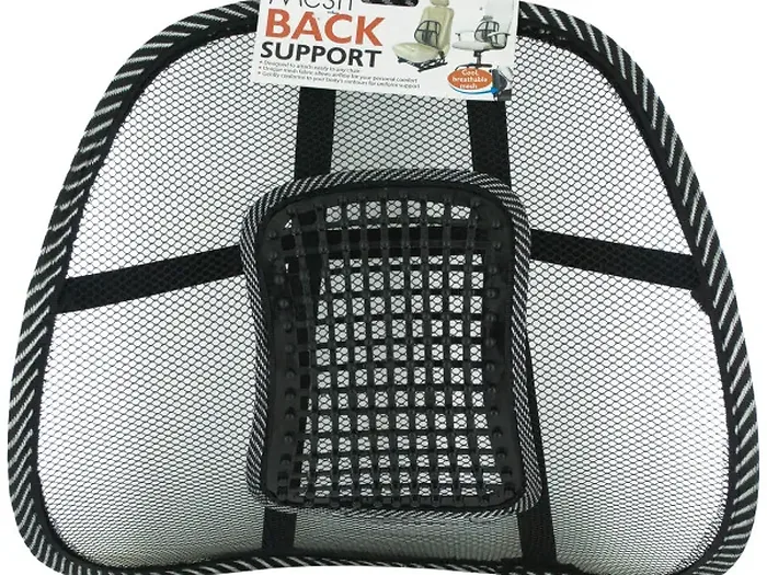 Ideal for home, office or auto, this Mesh Back Support features a lightweight design with cool, breathable mesh and embedded massage pegs. Designed to easily attach to any chair, it gently conforms to your body's contours for uniform support. Comes packaged in a poly bag with a header card.