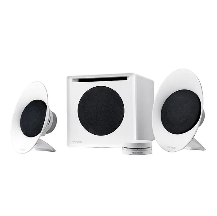 Microlab FC50WHITE Fc50 Wired 3.5mm54 Watt2.1 Channel Hiperformance Speaker W Digital Signal Processor Dsp Rotating Rf Remote Control For Pc And Multimedia Entertainment White