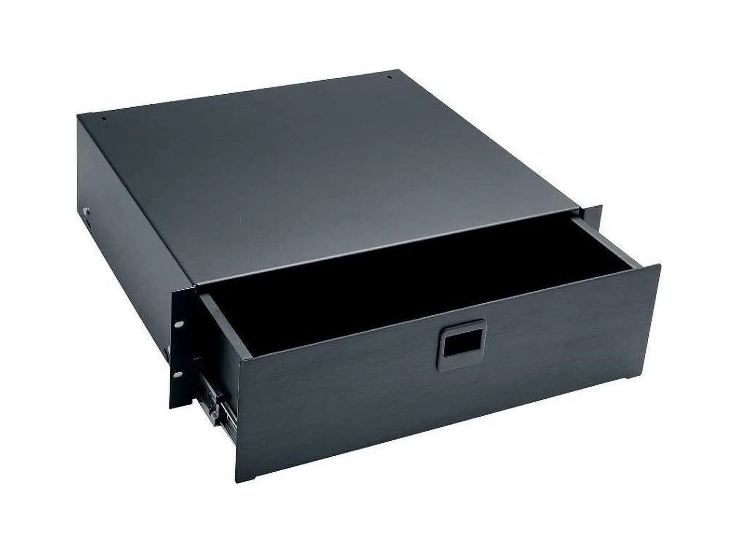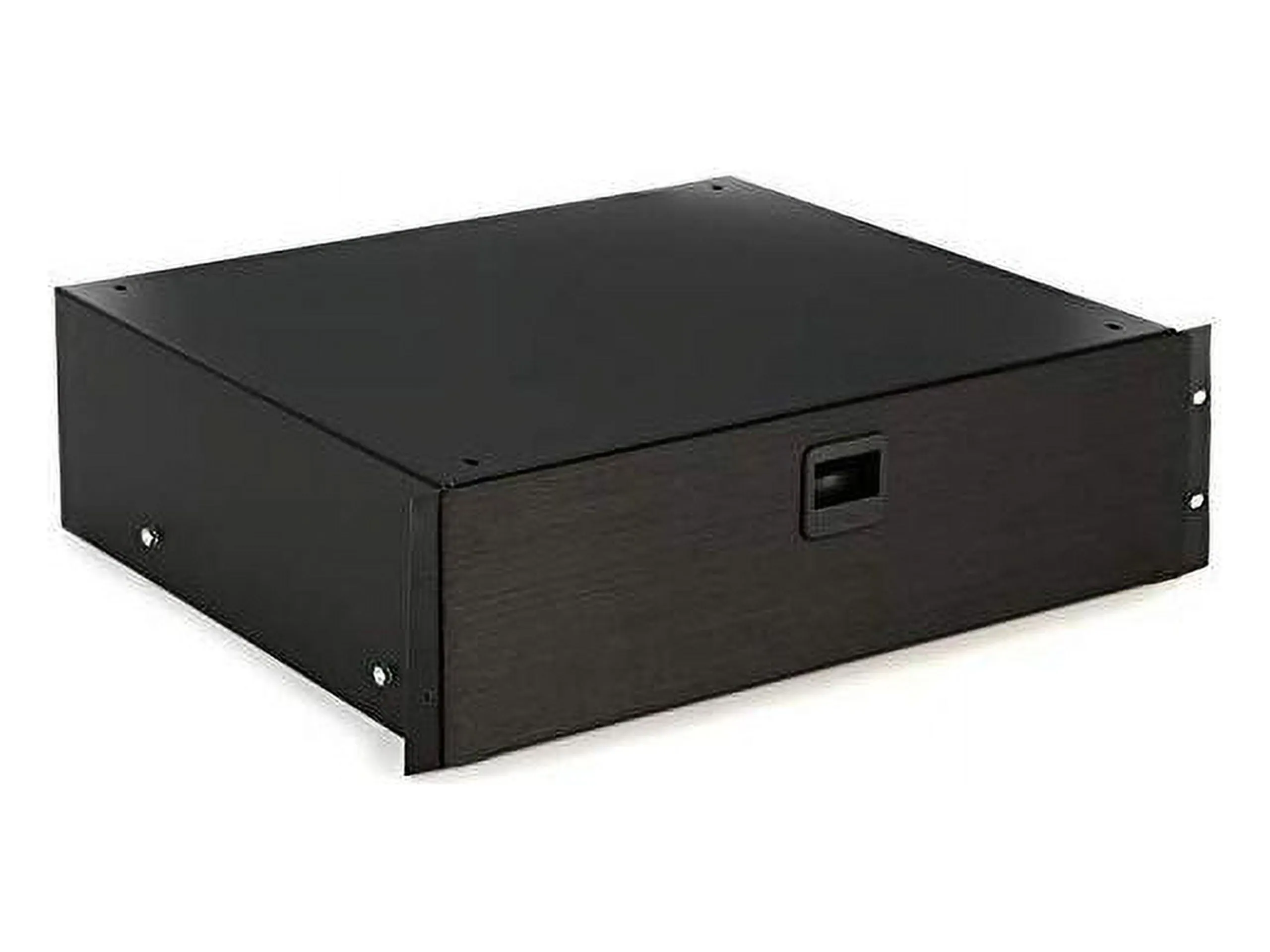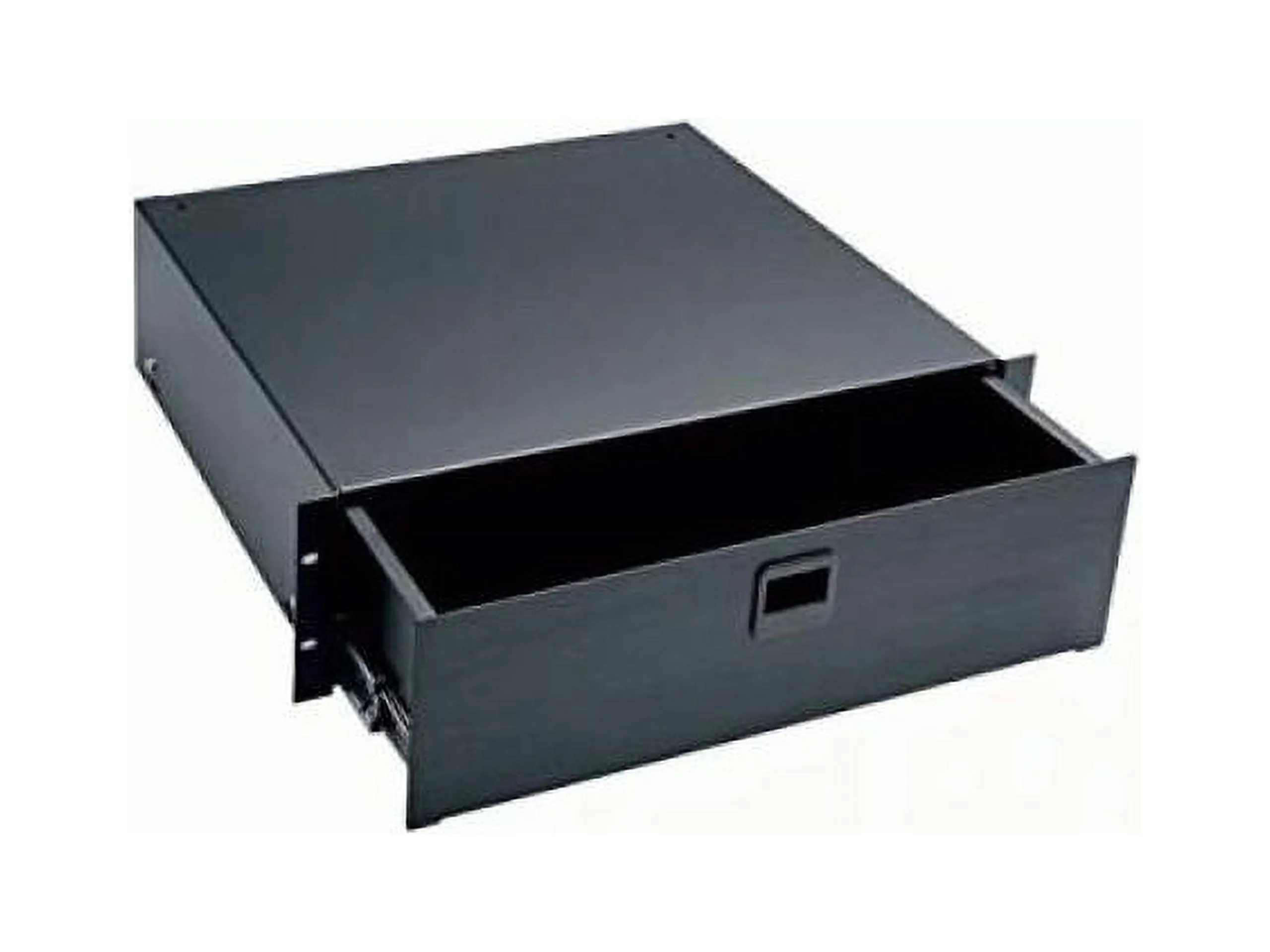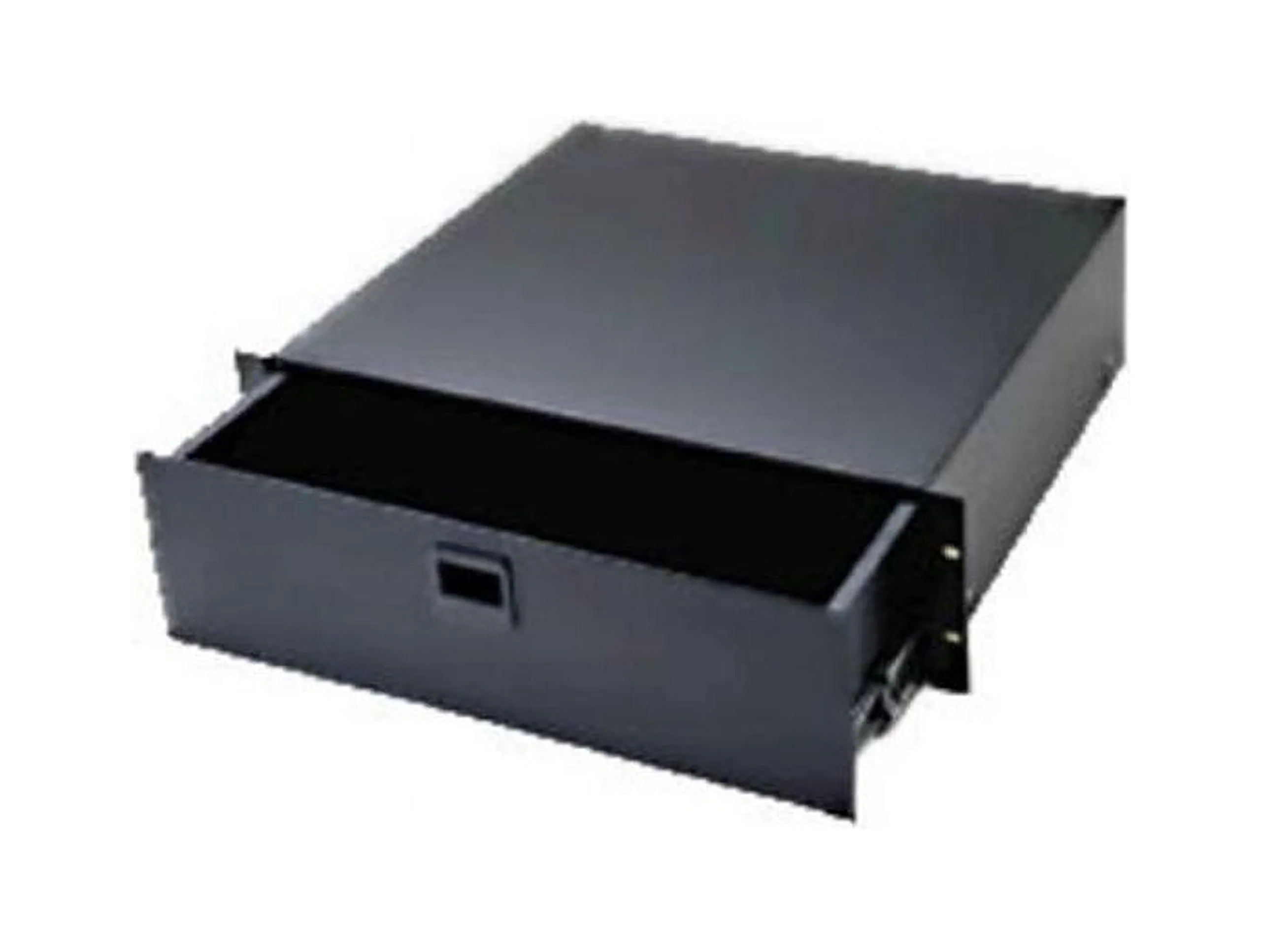 Fully enclosed with inside dimensions measuring 15 7/8in. wide by 14 1/2in. deep these drawers feature spring-loaded latches and rugged straightforward construction. Black Anodized Finish. Racking Height: 5-1/4in. (3 space).
