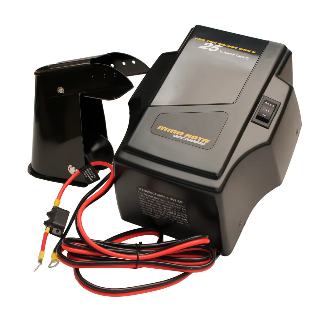 The Deckhand 25 has a 25-lb anchor capacity (anchor not included). Includes davit for stowing most styles of anchors. Pre-spooled with 60 feet of 800-lb test nylon rope. Runs on 12-volt battery (not included). Get precision boat placement and the ability to stay on the fish as long as you want with a Deckhand electric anchor winch. It automatically raises or lowers your anchor at the touch of a button, and its special anti-drag system senses the bottom to allow for controlled drifting. Features:- 25-lb anchor capacity (anchor not included)- Pre-spooled with 60 feet of 800-lb test nylon rope- Davit can be mounted at base of Deckhand or in remote position on deck- Davit stows most kinds of anchors- Stow and deploy switch integrated into the base of the unit- Auto-drift feature automatically stops the motor when the anchor touches bottom (or hits an obstacle) when slack in the rope becomes tight, rope is automatically released lock the winch with the touch of a button- Mounting hole pattern consistent with older Deckhand models (DH-18, DH-20, DH-35)- Includes: remote mountable anchor davit