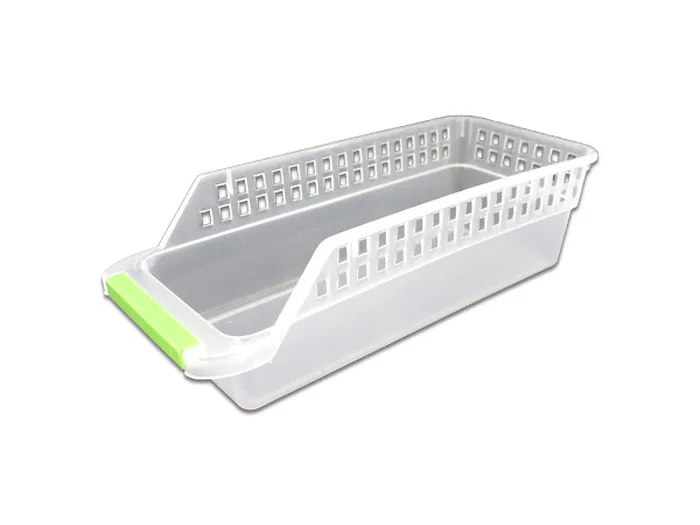 Made from durable plastic, it features a contemporary long design with transparent sides adorned with colorful strips. Ideal for your home, office, or classroom, this basket not only looks great but is also practical.