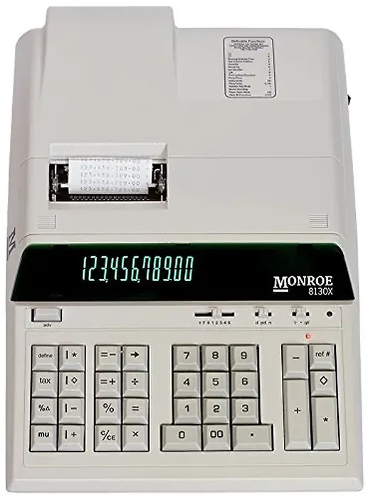 - WHAT'S INCLUDED: One Monroe 8130X printing calculator, power cord, instruction manual, one calculator cover, one Monroe M33X ribbon cartridge, and one Monroe 20lb. bond starter paper roll