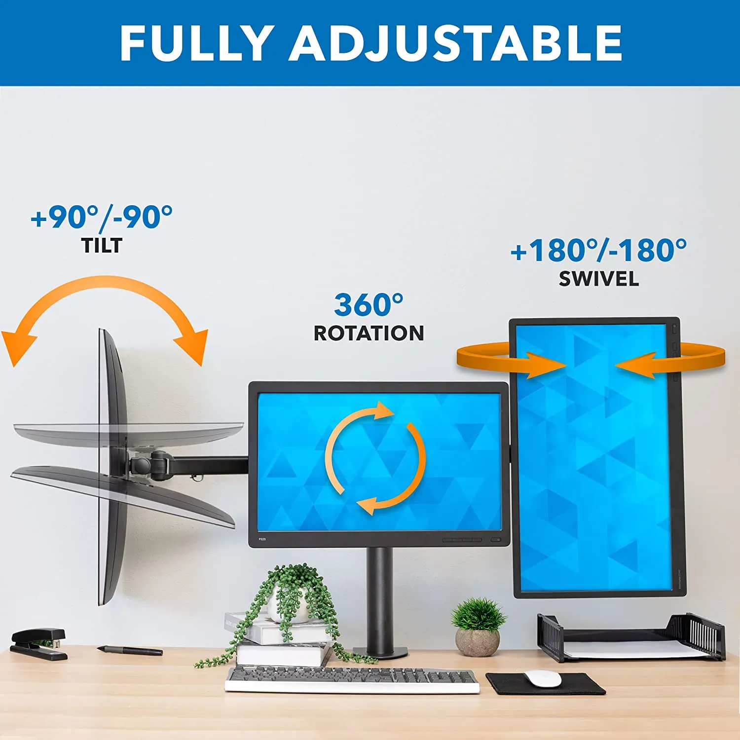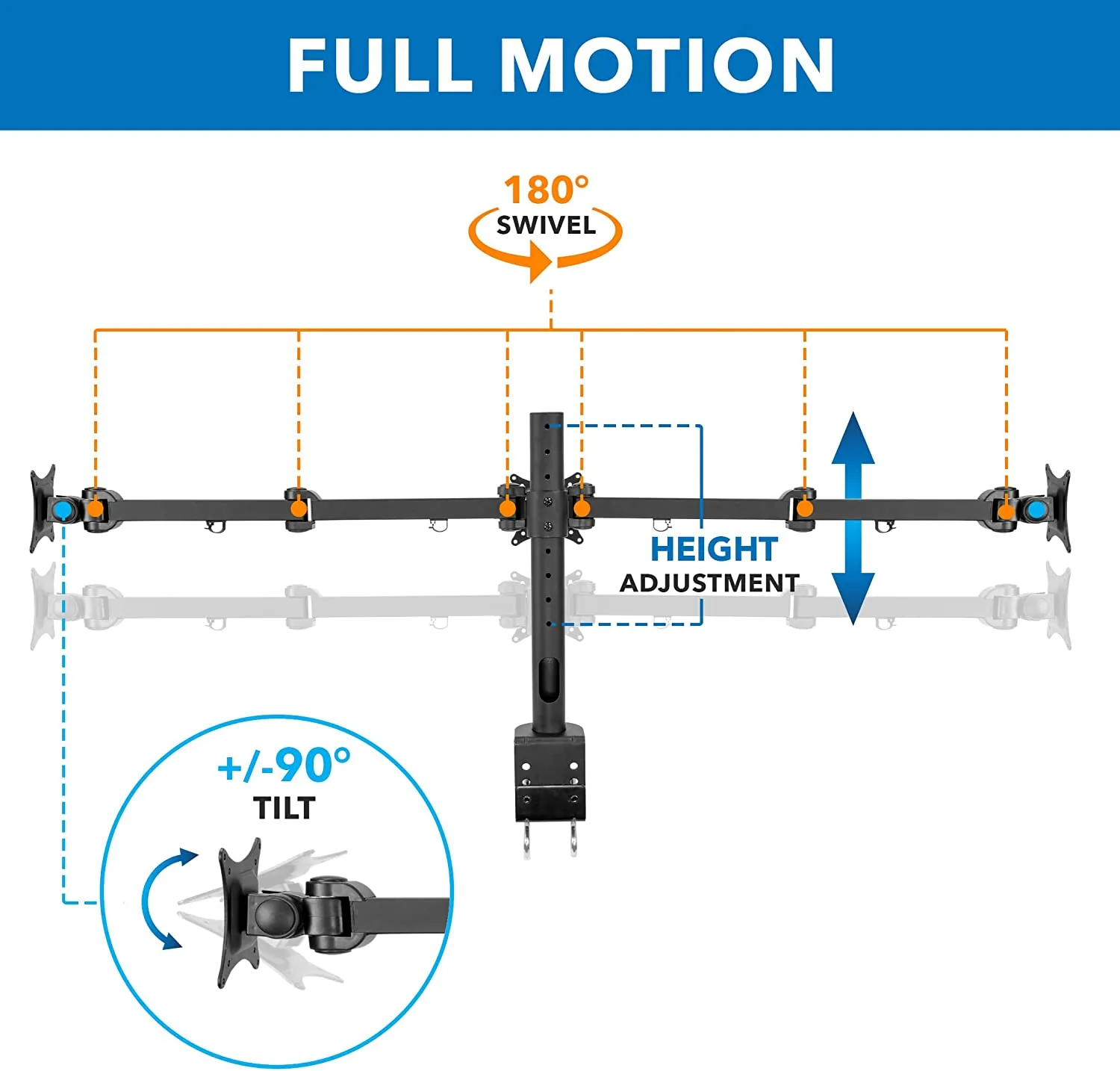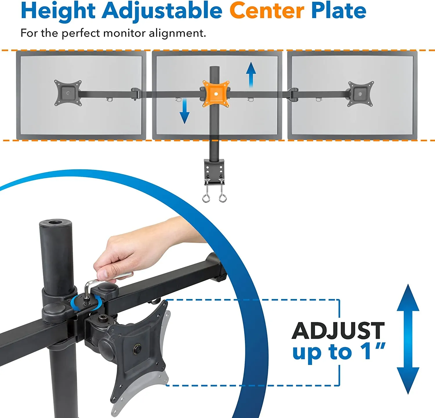 Fully adjustable, two of the three monitor arms can tilt 15 degrees and swivel 360 degrees, allowing you to find the perfect viewing angle. All three monitors can also rotate 180 degrees for effortless switching between landscape and portrait orientations. The height of the monitors can be adjusted on the middle pole to suit your needs.