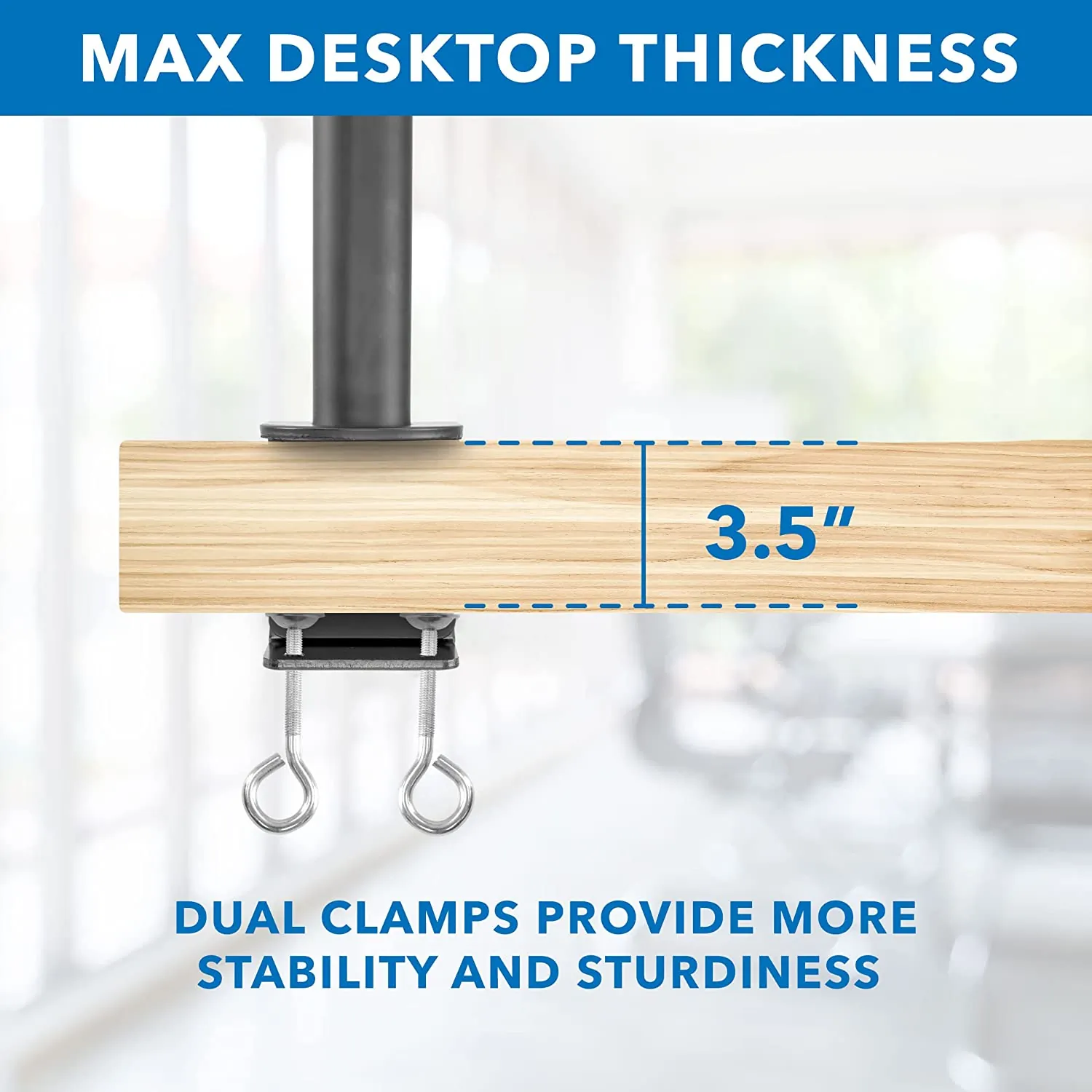 - Double C-clamp mount fits desktops up to 4 inches thick