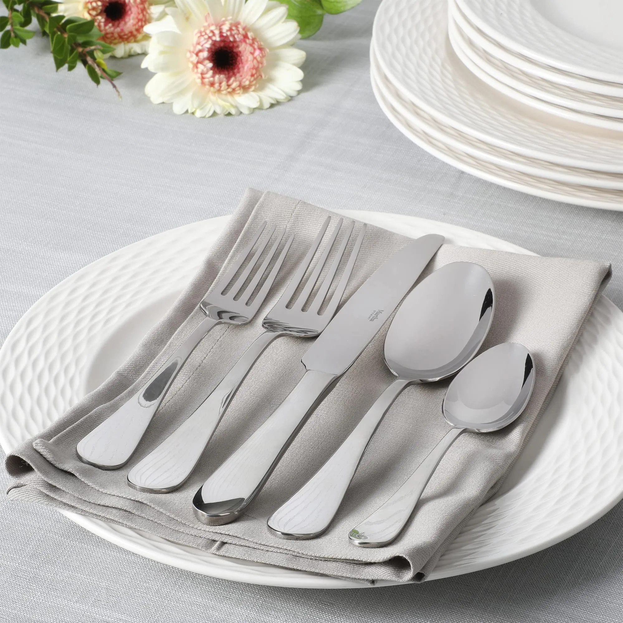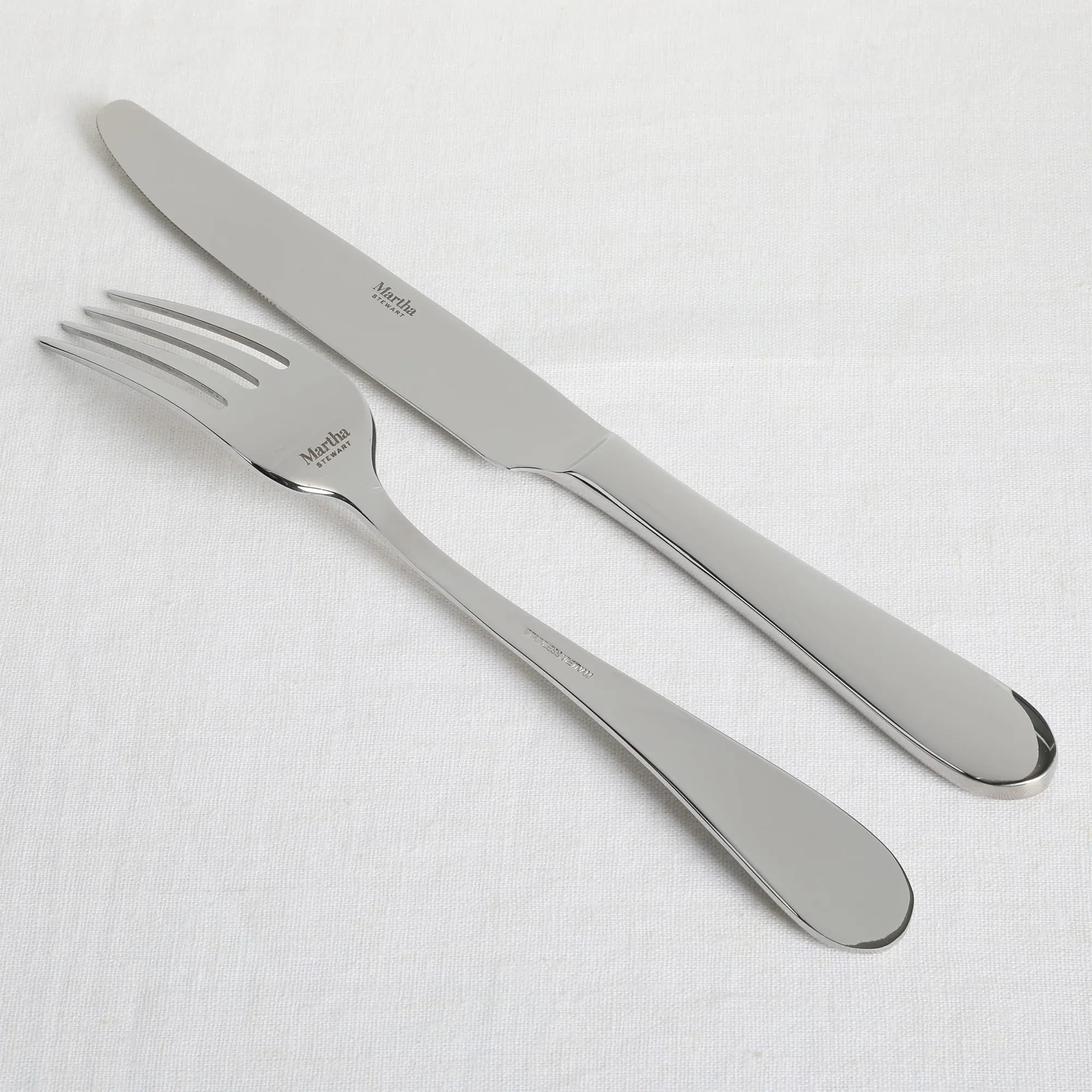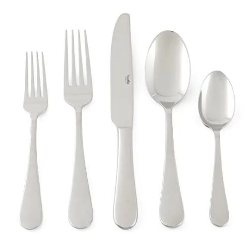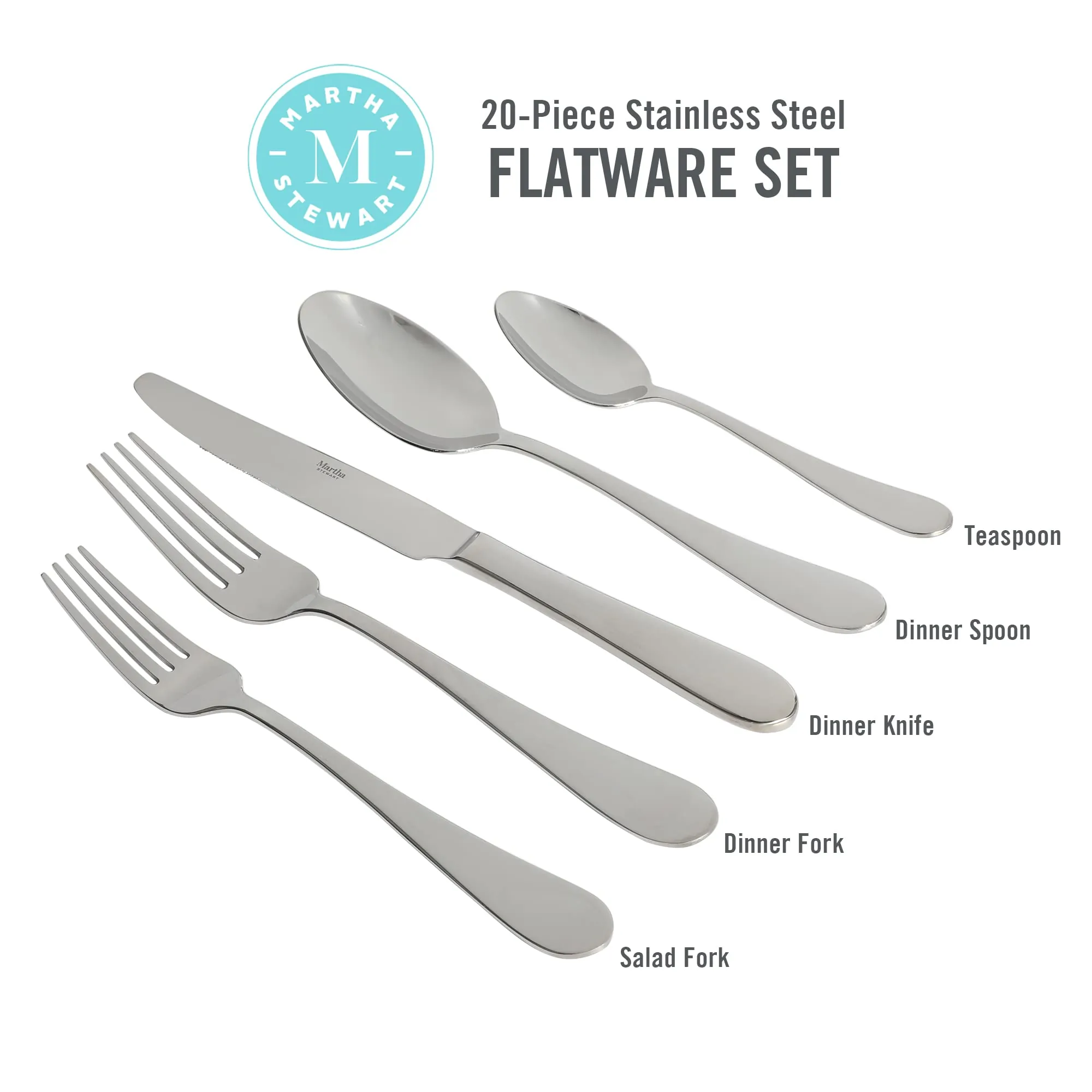 MS Alness 20 pc Flatware - Crafted from mirror-polished stainless steel, the Martha Stewart Alness 20-piece Flatware Set shines on any table. Featuring a streamlined teardrop design, this silverware set blends with modern and traditional decor alike. Place settings for four include all the essentials for full-course dining, from soup to dessert. Includes four of each: dinner forks, dinner spoons, dinner knives, salad forks, and teaspoons. Perfect for everyday use and elevated entertaining alike. Dishwasher safe. Includes 4 of each: dinner forks, dinner spoons, dinner knives, salad forks, teaspoons. Crafted from durable stainless steel. Ergonomic handles provide a balanced, comfortable grip. Features sleek tear drop design. Mirror-polished. Place settings for 4. 4 - DINNER KNIFE, 4 - DINNER FORK, 4 - DINNER SPOON,4 - SALAD FORK, 4 - TEASPOON.