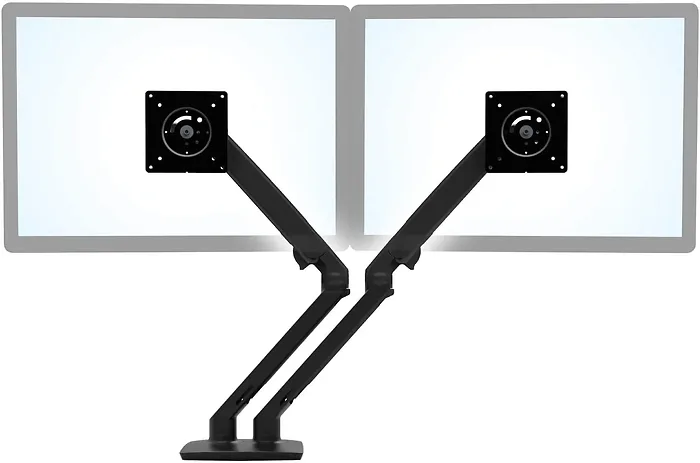 Enhance your workspace with the Dual Monitor Arm designed for optimal ergonomics. This sleek matte black arm allows for easy adjustable positioning of your monitors, reducing neck and eye strain.