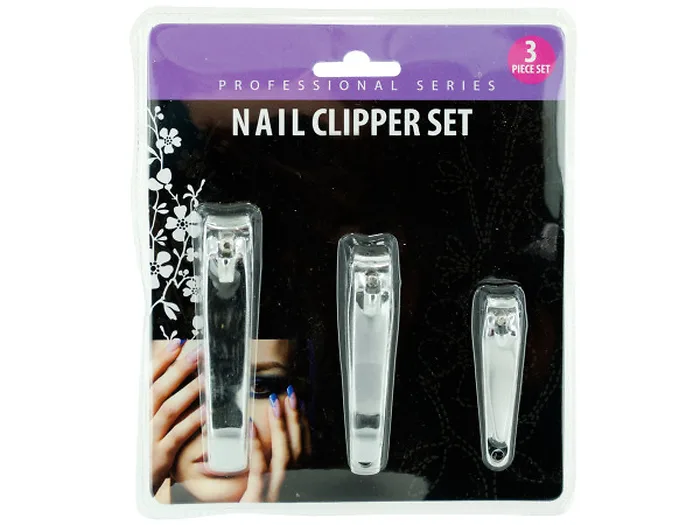 Great for manicures and pedicures, this 3-piece Nail Clipper Set is ideal for home or professional use. Each package includes 3 metal nail clippers: small, medium and large. Comes packaged in a clam shell.
