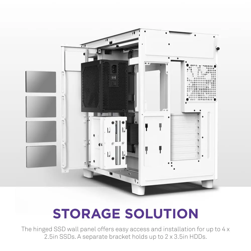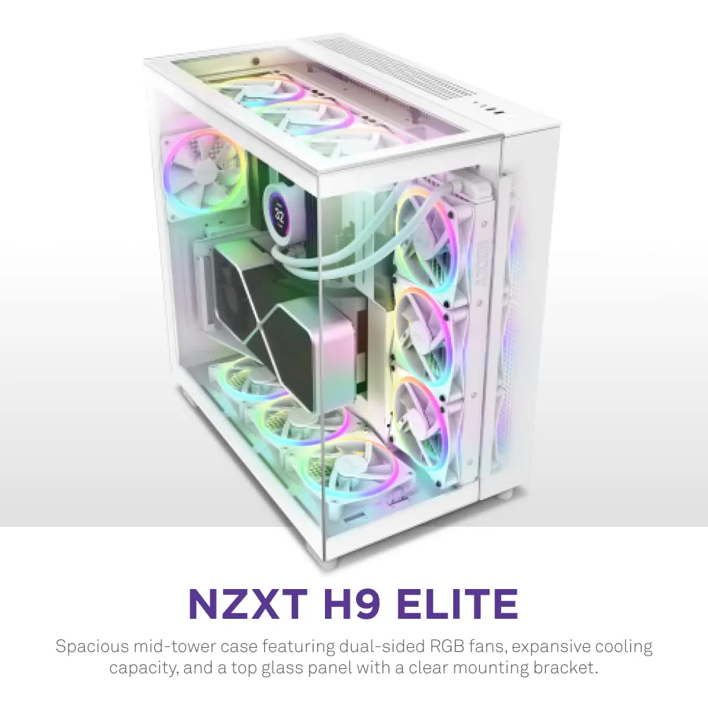 The NZXT H9 Elite is a premium mid-tower computer case designed for gamers and PC enthusiasts. With its all-white exterior and dual-chamber architecture, it combines aesthetics with exceptional airflow. This case supports various cooling options and is equipped with stunning RGB fans to enhance your build's visual appeal.