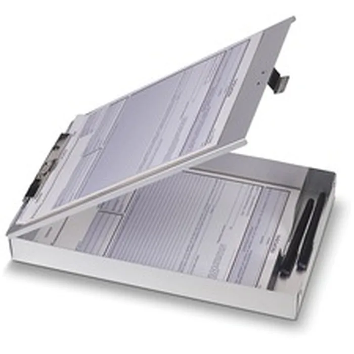 Aluminum, top-opening clipboard features a durable steel clip that holds 8-1/2" x 12" forms securely in place. Interior compartment is 1-1/2" deep and holds up to 50 additional forms. Clipboard includes a separate compartment for pencils and pens and a smooth outside writing surface.