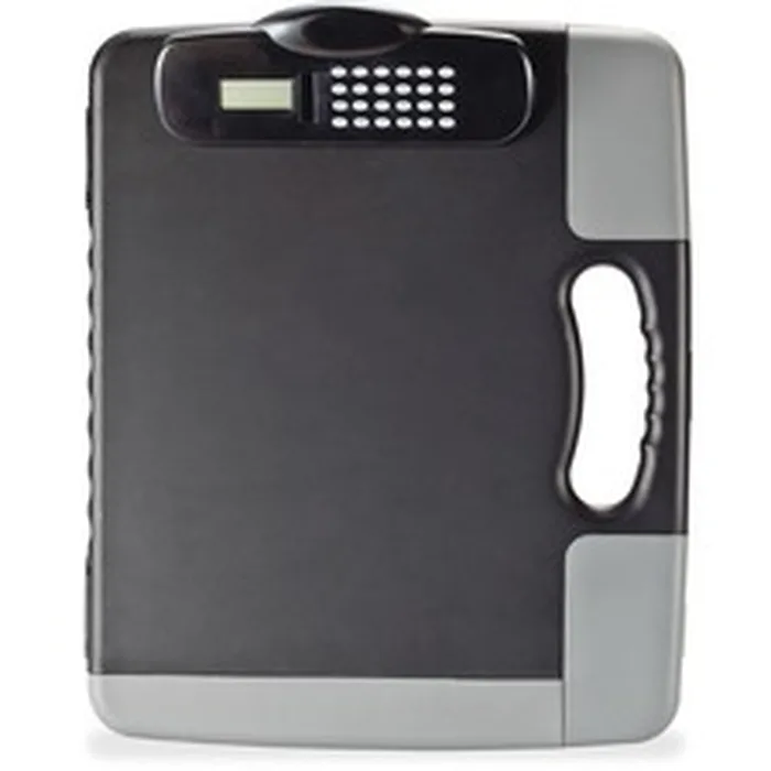 Heavy-duty portable clipboard with calculator doubles as a briefcase. Ergonomic hand grips let you carry it easily. Large capacity of this sturdy plastic clipboard offers room for papers, forms and notepads. Heavy-duty, low-profile clip includes a built-in calculator that is powered by solar and battery (included). Built-in filing pockets are perfect for CDs, business cards and papers. Three separate external filing compartments can be used for pens and other small items (one is magnetized to hold clips in place).
