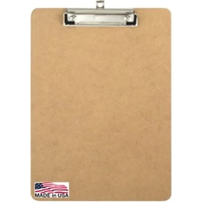 Low-profile clipboard is made from high-quality brown hardboard and designed for maximum durability. Rust-resistant steel clamp tilts back easily to load paper and securely holds up to 1" of paper. Clipboard is smooth on both sides and has beveled edges. Hardboard is made with recycled or recovered wood content.