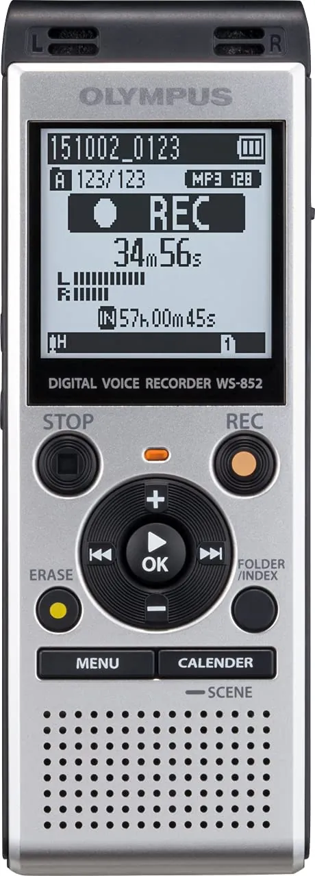 High-quality dictation device, audio recorder, notetaker in one. Regardless of your needs for either business or pleasure, the new WS-852 digital voice recorder combines high-performance stereo recording with smart functionality. This not only makes it a pleasure to use, but also easy to handle in any situation. Stereo feeling in every recording. The low-noise directional stereo microphones with a 90 layout deliver a superb stereo feeling enabling you to feel even the smallest details of the meeting. Regardless of where the person speaking is located or the direction of speech, you can clearly capture the information. Does the adjusting for you. To make listening to your recordings more comfortable, Intelligent Auto Mode automatically adjusts the recording level to match the volume of the sound source. When a speaker is talking very loudly, the recorder reduces the input level, and for soft voices the recorder increases the input level to always provide an even level of volume. Made for beginners. Just as perfect for advanced. With two different display modes, you can use your voice recorder even if you are a beginner. Simple Mode displays only essential information in large font and limits the menu options to frequently-used functions. For advanced users, full functionality of menu options is available in Normal Mode. The simplest way to save data. Save data easily and conveniently with the built-in USB connector. Simply slot it into your PC or Mac to transfer voice recordings from the device to an external hard disk drive. You can also use it like a USB stick to share documents. For the WS-852, the USB connector has an additional internal battery charge function for further peace of mind. MICRO SD CARD SLOTFor microSD/SDHC cards up to 32GB. BUILT-IN STANDConvenient for desktop recording. RETRACTABLE USB STICKCable-free connectivity to a PC or Mac. LOW-NOISE DIRECTIONAL MICROPHONESFor high-quality stereo sound. LARGE LCD DISPLAYEasy-to-read 1.61-inch display....