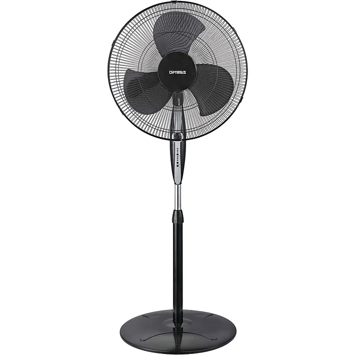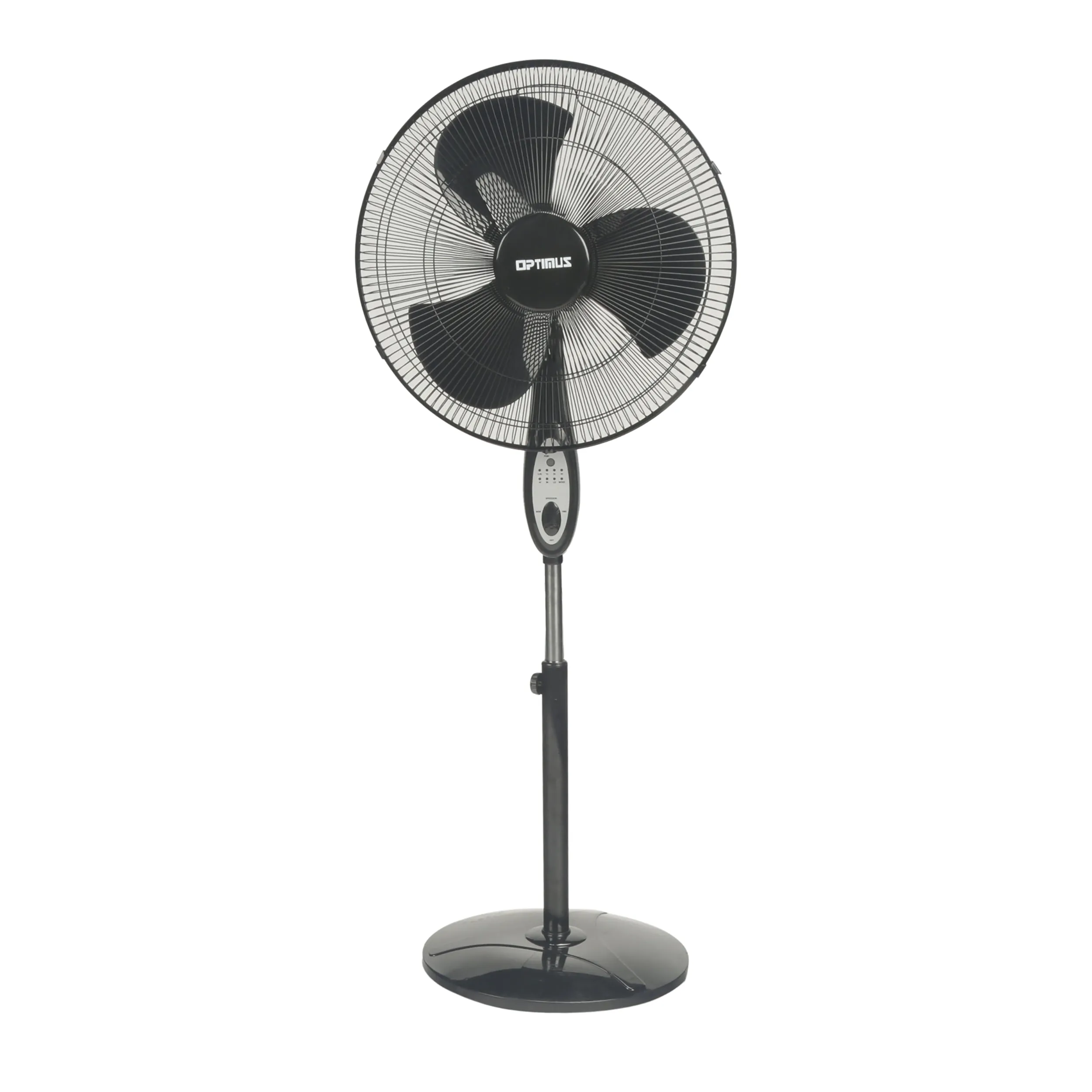 The Optimus 18 in. Oscillating Stand Fan with Remote features 3 speeds of energy-saving and whisper-quiet operation. It has a 4-position piano key switch on the pole and 90-degree oscillation. The height and tilt angle are also adjustable. Stay cool and comfortable all summer long with the Optimus 18" Oscillating Stand 3-Speed Fan. In addition to its three different speeds, it boasts many specialized functions to give its users an ideal experience. A handy remote gives you easy control over the stand fan without having to get out of your bed or couch. It also features a timer that can be for 0.5, 1, 2 or 4 hours. Height-adjustable and equipped with a 75-degree oscillation range, this Optimus device provides great coverage. This fan is ETL listed for safety, and has 1 year limited warranty. Enjoy a cool breeze this summer with this durable and efficient stand fan from Optimus.