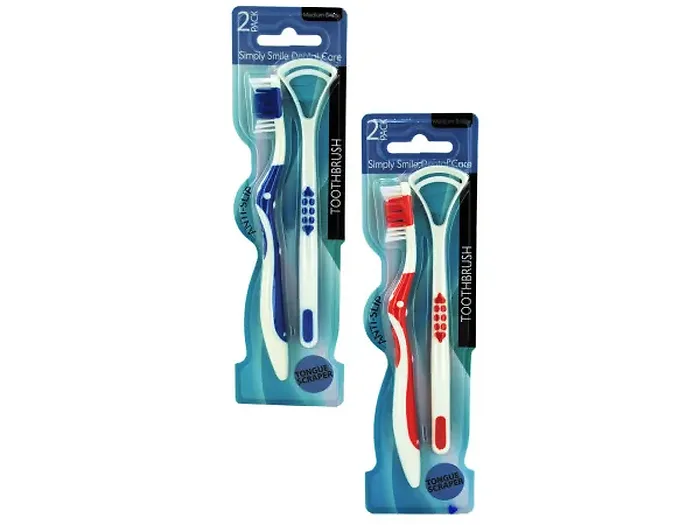 Keep your mouth fresh and clean with this 2-piece Oral Care Set featuring 1 medium bristle toothbrush with an anti-slip handle and 1 tongue scraper. Comes in assorted colors. Comes packaged in a blister pack.