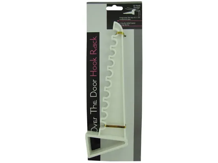 Maximize your organization with this stylish over-the-door hook rack, designed to fit securely on the top of a standard 1.25" residential door. Made from durable plastic, this rack can hold up to 10 hangers, providing ample space for coats, bags, and accessories. Its sleek white finish complements any decor, making it a practical addition to your home. With an overall length of 8 3/4" and a hook area of 7 3/4", it offers functional and efficient storage.