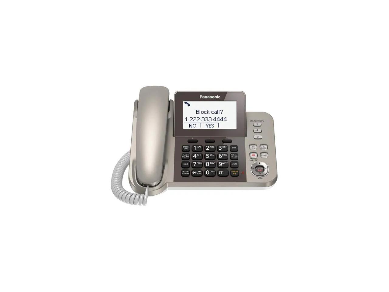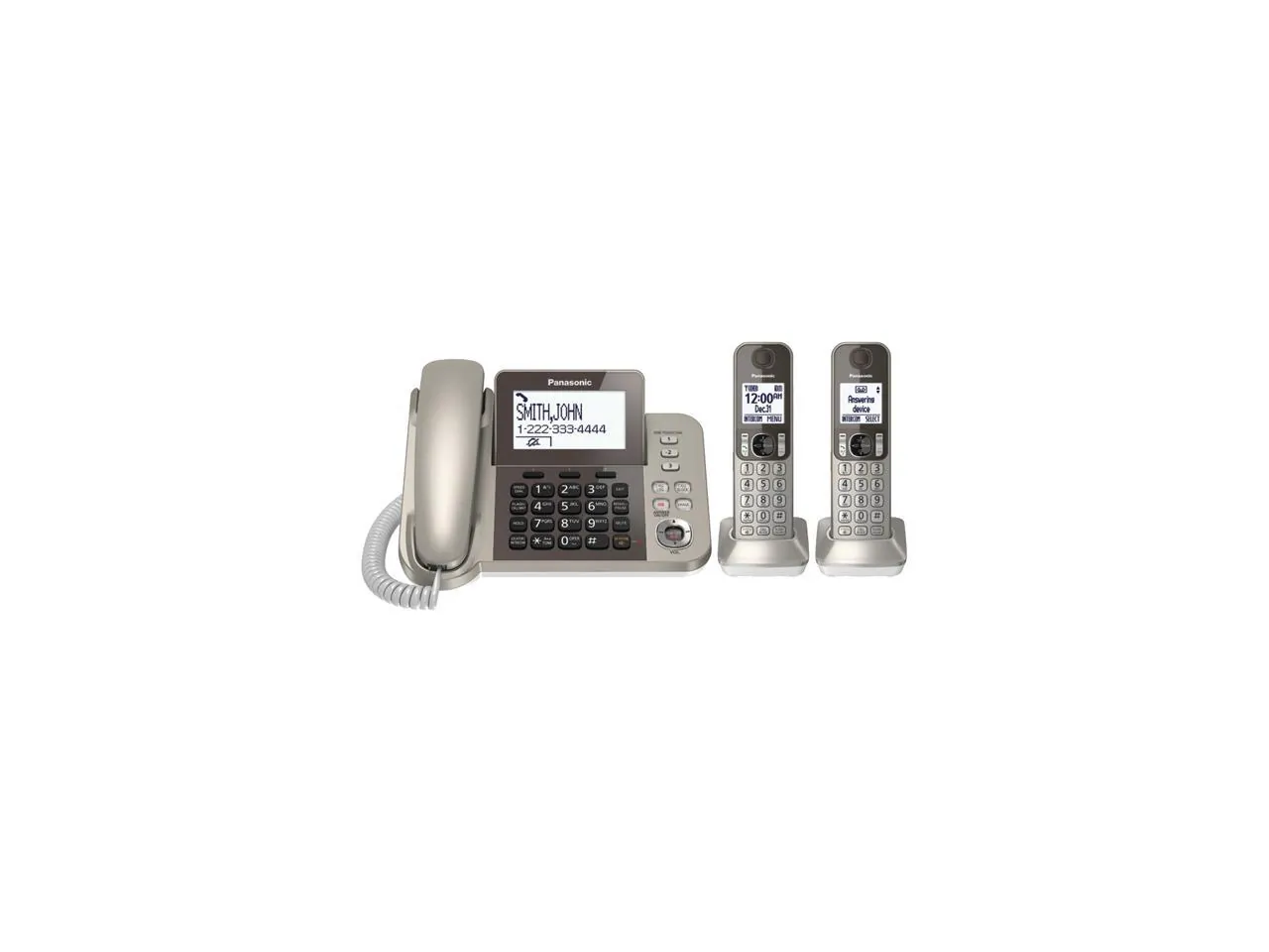 Panasonic Corded Phone with 2 Cordless Handset, TAD, Silver Black. Corded Phone with 2 additional Handsets included, 3.4" Tilt Backlight Display, Call block up to 250 #'s with Call Block button, Full Speakerphone (Base & Handset), 17 minute TAD, 100 # Phonebook, Talking Caller ID, Power Back-up, Baby Monitor, Headset Jack & Belt Clip, 13 Hour Talk and 12 day standby, Silver & Black