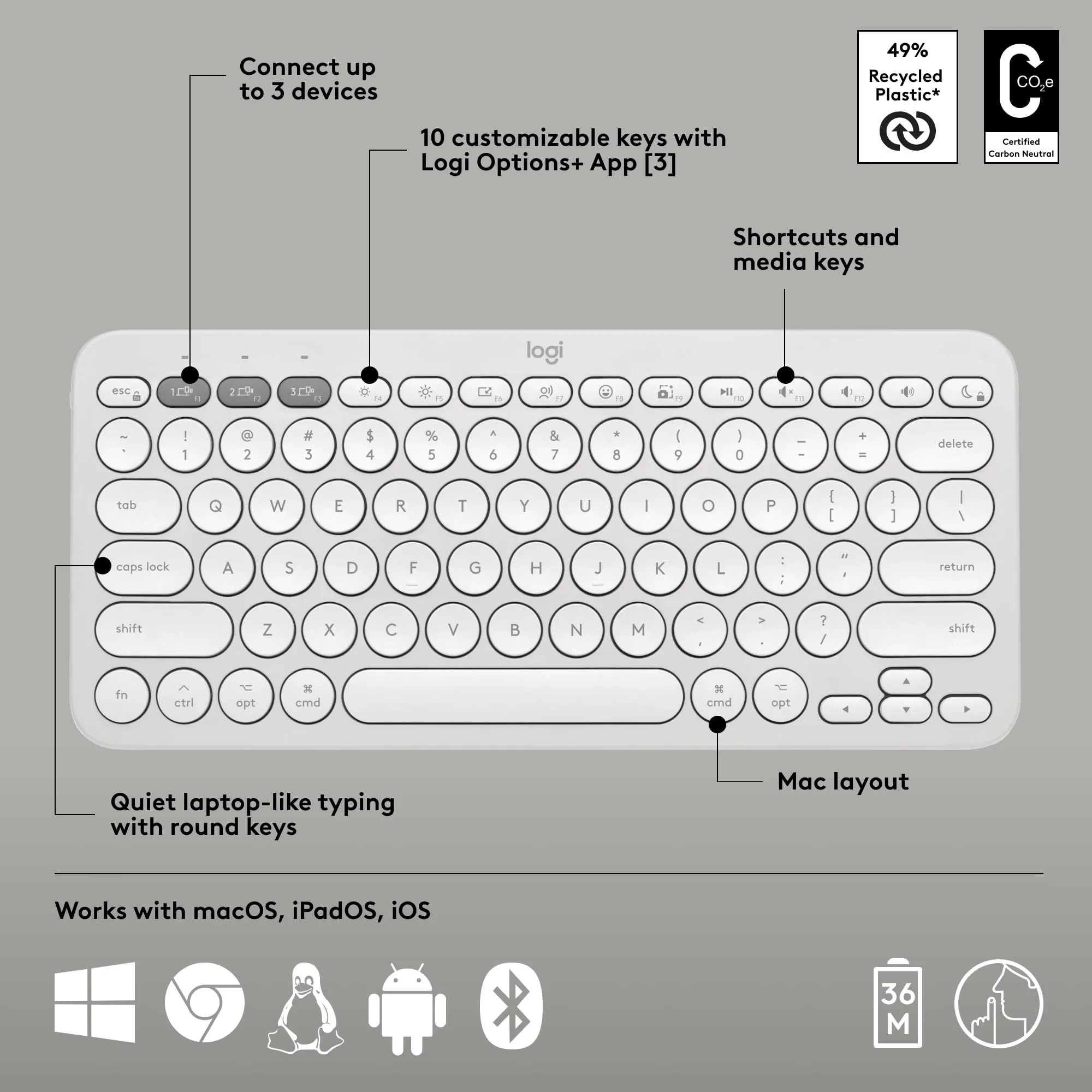 The Pebble 2 Combo MK for Mac offers a sleek and minimalist design that perfectly complements your Mac setup. Its tonal white finish adds a touch of elegance, while the compact layout ensures it fits comfortably in any workspace.
