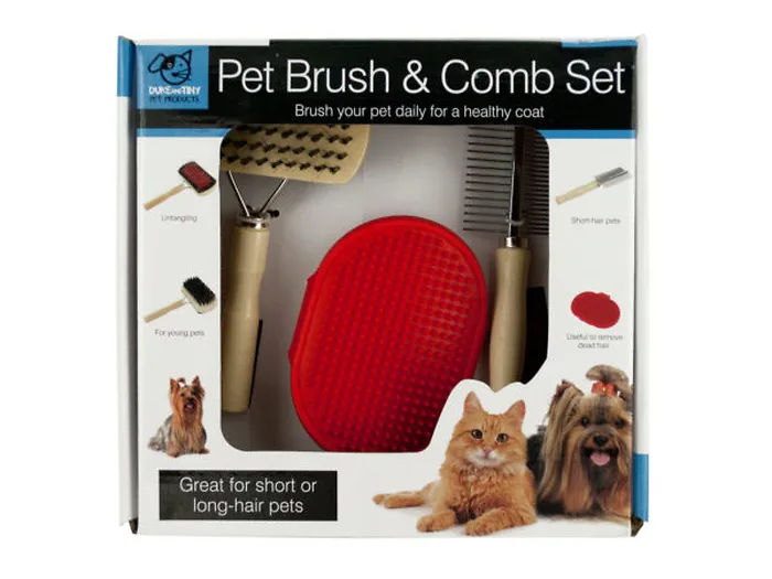Great for short or long-hair cats and dogs, this 3-piece Pet Brush & Comb Grooming Set features a variety of brushes and a comb to untangle, remove dead hair and smooth fur. Set includes: 1 two-sided general use wooden brush, 1 flexible rubber sleeve brush and 1 two-sided metal comb with a wooden handle. For pets of all ages. Comes packaged in an individual box. Box measures approximately 9.75" x 2.75" x 9.25".