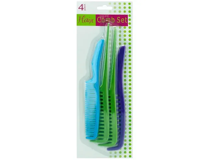 Perfect for parting, untangling and styling hair, this 4-piece Plastic Comb Set Combs features an assortment of combs in fun colors including blue, purple and green. Comes packaged in a blister pack.