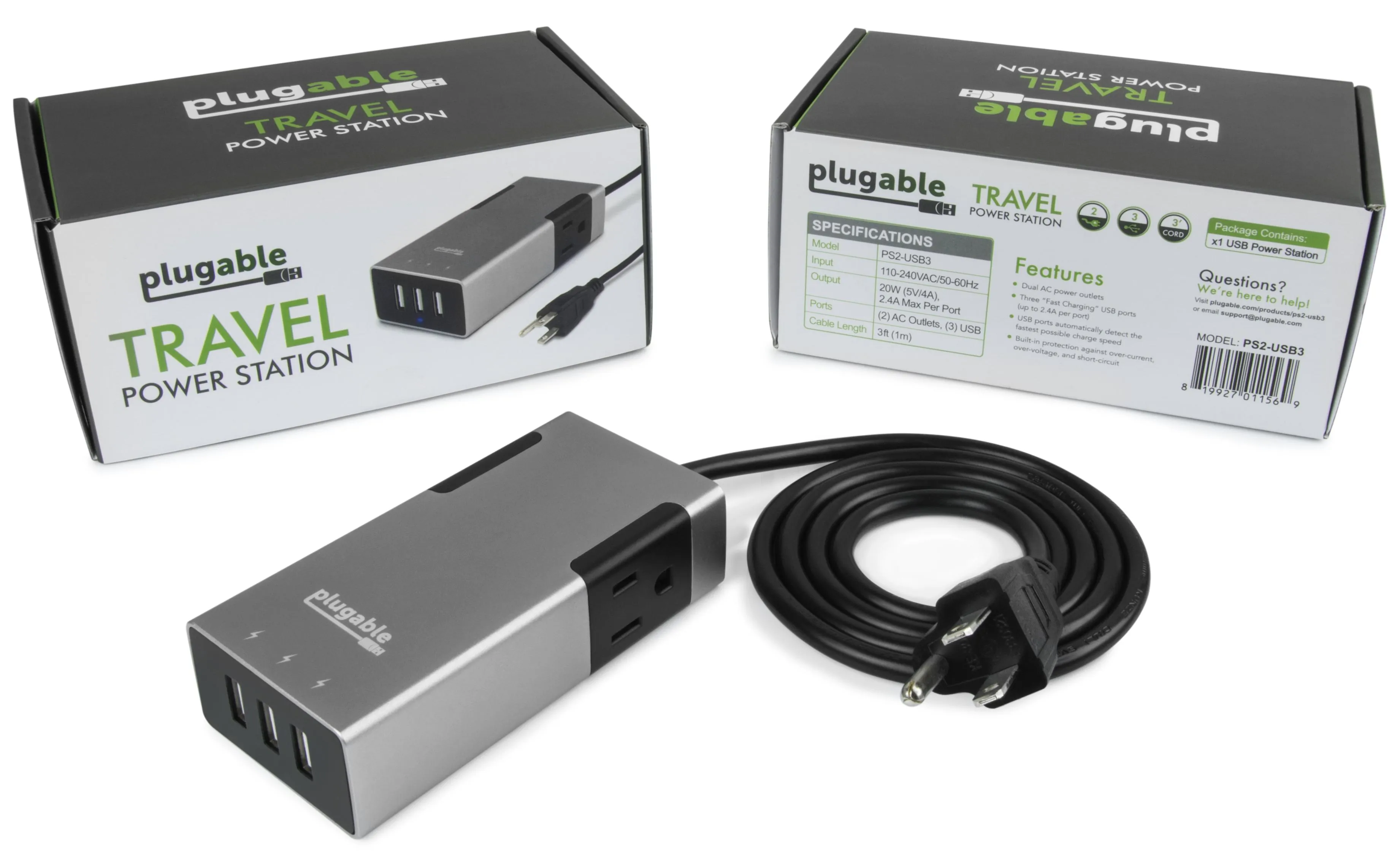 Plugable PS2-USB3 Plugable 2outlet Travel Power Strip