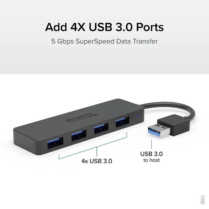 Expand your computer's connectivity with the Plugable USB 3.0 4-Port Hub. This compact hub allows you to connect up to four USB devices simultaneously while providing high-speed data transfer rates of up to 5 Gbps. Ideal for both personal and professional use, it is perfect for connecting peripherals such as mice, keyboards, flash drives, and more.