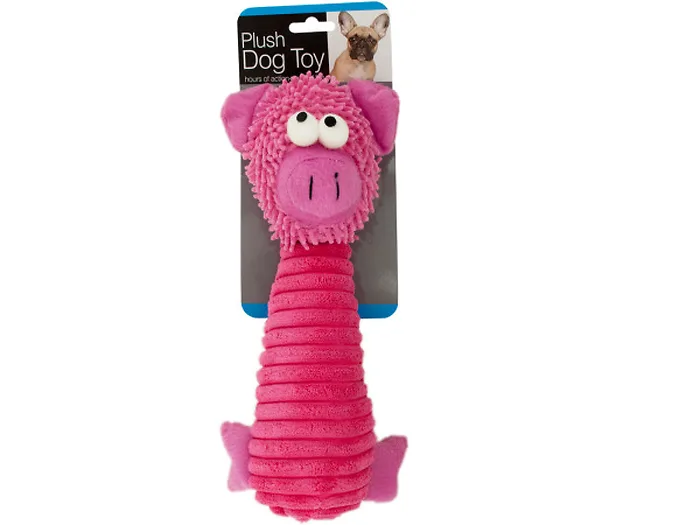 Great for hours of action-packed fun, this Plush Animal Squeak Dog Toy features a colorful plush animal made with a variety of fabrics with a squeaker inside. Measures approximately 12" long. Comes in assorted styles: dog, pig and chicken. Comes packaged to a hanging panel.