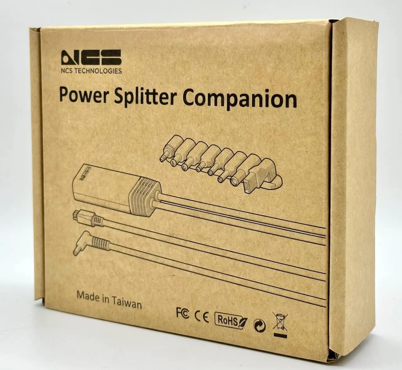 The NCS Technologies Power Splitter provides power to various devices from a docking station or laptop, allowing you to power and charge your laptop as well as other devices simultaneously using only one power outlet. The Power Splitter supports up to a 19.5V 4.2A power supply from a docking station power adapter to a laptop. It supports up to a 19.5V 4.8A power supply from a docking station power adapter to a dock. It includes 8 common models of power tip adapters for various major brands such as HP, Dell, Toshiba, Acer, ASUS, and Lenovo. One specific model of the power tip adapter can be connected to the power jack, and be changed to use different power tips.