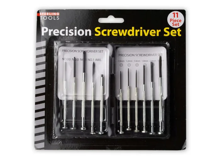 Great for professionals and home craftsmen, this 11-piece Precision Screwdriver Set features hardened and tempered steel blades with blued finish to resist corrosion and swivel-head handles with bright plated shafts fluted for grip. All come conveniently stored in a plastic case. Case measures approximately 4 1/2" x 3. Comes packaged in a blister pack.