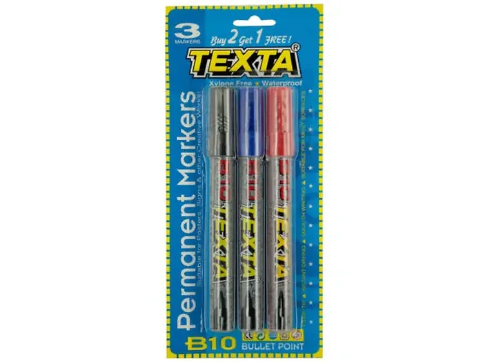Enhance your creative projects with the Premium Bullet Point Permanent Markers Set. Ideal for crafting posters, signs, and labelling your belongings, this 3-pack set includes markers in black, blue, and red, each featuring vibrant, instant-drying ink.