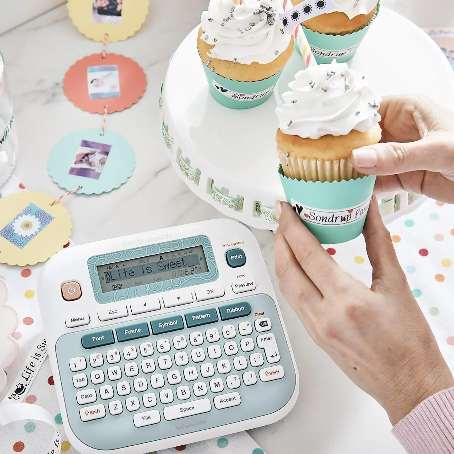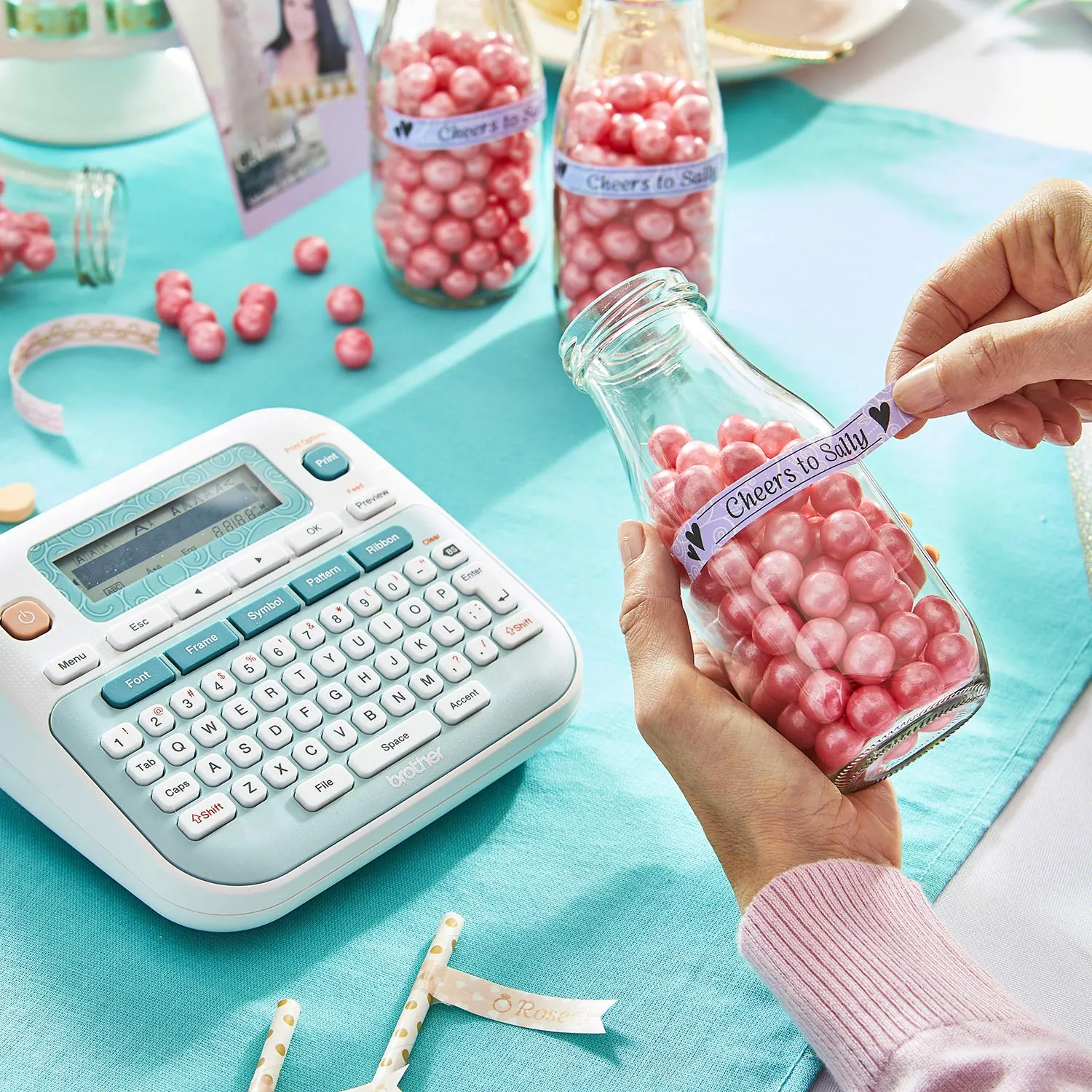 - Prints labels with decorative ribbons and tape
