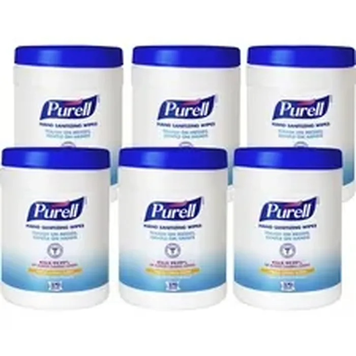 Sanitizing wipes kill 99.99 percent of most common germs in as little as 15 seconds. Use this tub dispenser of PURELL Sanitizing Wipes with floor stands and wall brackets (both sold separately) to create a positive and lasting impression with guests, customers and employees. Tested for surface compatibility, wipes do not harm vinyl, plastic, metal or rubber. Nonlinting, durable, textured wipe is convenient for use whenever soap and water are not available. Each wipe measures 6" x 6-3/4".