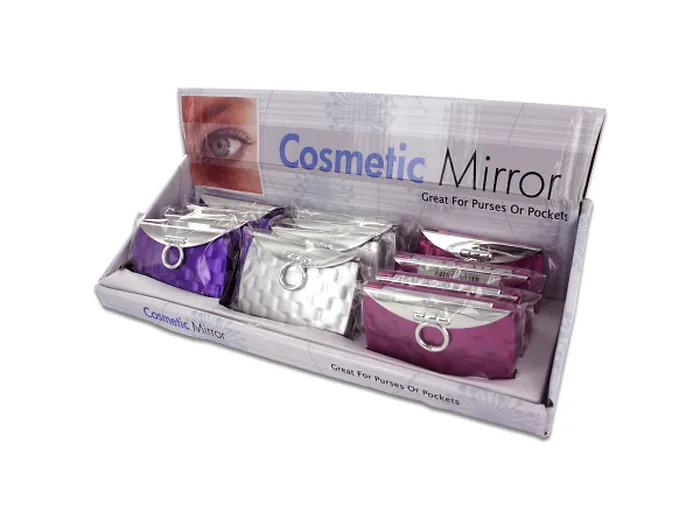 Great for on the go, these Purse Design Cosmetic Mirrors are double-sided, have a fun quilted purse design and easily fit inside bags or pockets. Mirrors have two sides: one standard and one magnified. Comes in assorted colors: purple, magenta and silver. Mirrors measure approximately 2 1/4" x 3" when closed. Countertop display comes with 12 pieces.
